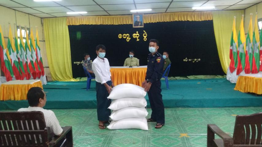 အခမ်းအနားတွင် COVID-19 ထိန်းချုပ်ရေးနှင့် အရေးပေါ်တုံ့ပြန်ရေးကော်မတီ ဥက္ကဌ မြို့နယ်အုပ်ချုပ်ရေးမှူး ဦးကျော်သူက မြန်မာနိင်ငံ ဆန်စပါးအသင်းချုပ်မှ ပေးအပ်လှူဒါန်းထားသော ဆန်အိတ်(၂၆)အိတ်သည် မြို့နယ်အတွင်းရှိ ဇူလိုင်လ(၂၁)ရက်နေ့၌ Facility Quarantine ရှိနေသူ(၁၇၂) ဦး အတွက် တစ်ဦးလျှင် ဆန် (၃)ပြည် နှင့် နို့ဆီဗူး(၅)ဗူးစီ ထောက်ပံ့ပေးသွားခြင်းဖြစ်ကြောင်း ပြောကြားပြီး Quarantine Center အလိုက် တာဝန်ယူ ထားကြသည့် တာဝန်ခံများ၊ ရပ်ကွက်ကျေးရွာအုပ်စုအုပ် ချုပ်ရေးမှူးများ၊ စာရေးများလက်သို့ ဆန်အိတ်များ လွှဲပြောင်း ပေးအပ်ခဲ့ကြောင်း သိရသည်။