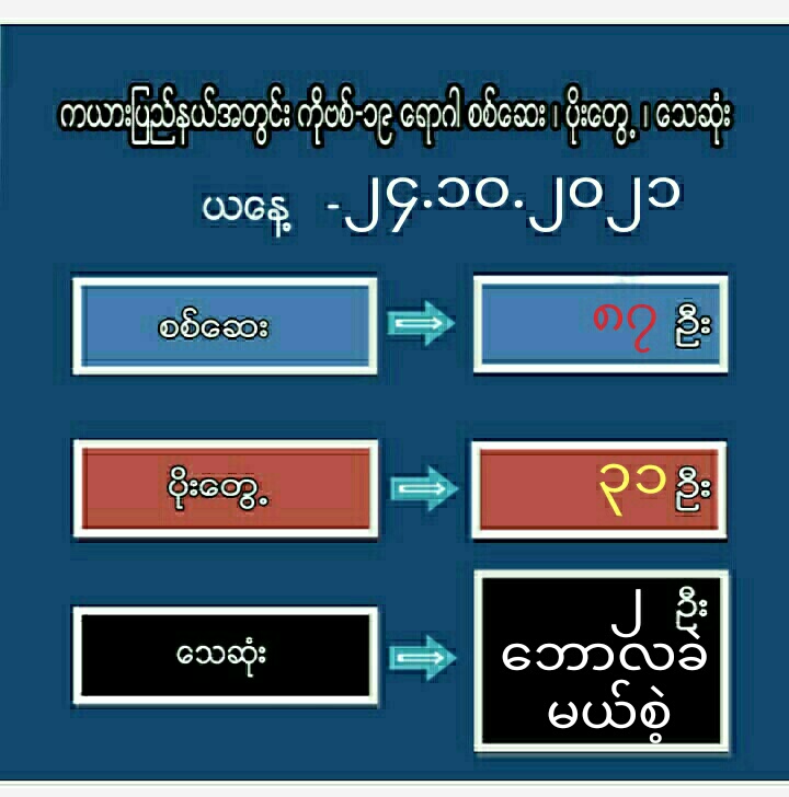 ကယားပြည်နယ်အတွင်းရှိ မြို့နယ်များတွင် Quarantine ထားရှိသူများနှင့် အောက်တိုဘာလ (၂၄)ရက်နေ့အထိ အနံ့ပျောက်၍ လာရောက်ပြသသူများ၊ ၎င်းတို့နှင့်ထိတွေ့ ဆက်စပ်သူ(၈၇) ဦးတို့အား Covid-19 Antigen Rapid Diagnostic Test (RDT) ဖြင့်စစ်ဆေးခဲ့ရာ (၃၁) ဦးမှာ Positive ဖြစ်ပါသဖြင့် ယနေ့ပိုးတွေ့လူနာသစ် (၃၁)ဦး ရှိရာ ၎င်းပိုးတွေ့လူနာများအနက် လွိုင်ကော် ဆေးရုံကြီးတွင် (၁) ဦး၊ လွိုင်ကော်မြို့နယ်ရှိ (PMC)များတွင်(၅)ဦး၊ ဘောလခဲမြို့ တပ်မတော်ဆေးရုံတွင်(၈)ဦး၊ ဘောလခဲ ဆေးရုံတွင်(၂) ဦးနှင့် brought death (၁)ဦး၊ ဘောလခဲမြို့နယ်ရှိ (PMC)များတွင် (၃)ဦး၊ ဖားဆောင်းမြို့နယ်ရှိ (PMC) များတွင် (၂)ဦး၊ မယ်စဲ့မြို့နယ်ဆေးရုံတွင် brought death (၁)ဦး၊ မယ်စဲ့မြို့နယ်ရှိ (PMC) များတွင် (၈)ဦး ထားရှိကုသပေးလျက်ရှိကြောင်း သိရှိရသည်။