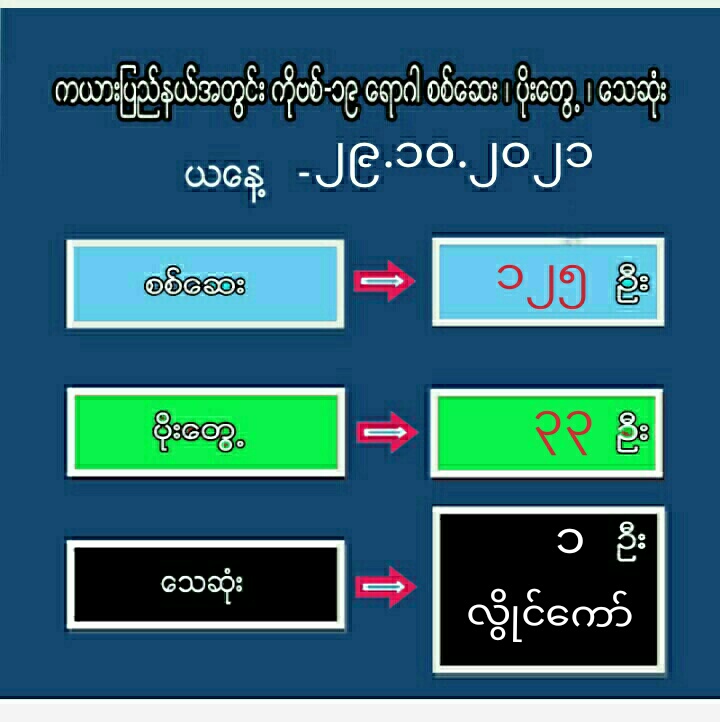 လွိုင်ကော်ပြည်သူ့ဆေးရုံကြီးတွင် Genexpert ဖြင့်(၁)ဦး စစ်ဆေးခဲ့ရာ(၁)ဦး ပို့းတွေ့ရှိခဲ့ပြီး ကယားပြည်နယ်အတွင်းရှိ မြို့နယ်များတွင် Quarantine ထားရှိသူများနှင့် အောက်တိုဘာလ (၂၉)ရက်နေ့အထိ အနံ့ပျောက်၍လာရောက်ပြသသူများ၊ ၎င်းတို့နှင့်ထိတွေ့ ဆက်စပ်သူ( ၁၂၅) ဦး တို့အား Covid-19 Antigen Rapid Diagnostic Test (RDT) ဖြင့်စစ်ဆေးခဲ့ရာ (၃၂) ဦးမှာ Positive ဖြစ်ပါသဖြင့် ယနေ့ပိုးတွေ့လူနာသစ် (၃၃)ဦး ရှိရာ ၎င်းပိုးတွေ့လူနာများအနက် လွိုင်ကော် ဆေးရုံကြီးတွင်(၅) ဦး၊ ဘောလခဲမြို့နယ်ဆေးရုံတွင်(၄)ဦး၊ ဘောလခဲမြို့နယ်ရှိ (PMC)များတွင် (၁၆) ဦး၊ ဖားဆောင်မြို့နယ်ရှိ(PMC)များတွင် (၁)ဦး၊ မယ်စဲ့မြို့နယ်ရှိ(_PMC) များ တွင်(၇)ဦး ထားရှိ ကုသပေးလျက်ရှိကြောင်းသိရှိရသည်။