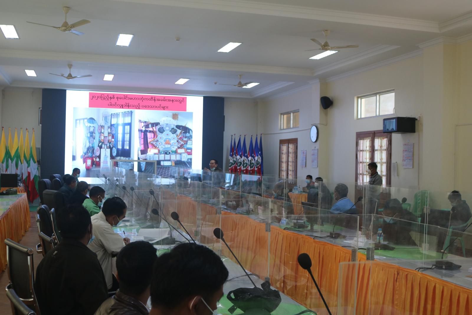 ထို့နောက် စုပေါင်းမဟာဘုံကထိန် အလှူတော်မင်္ဂလာ ကျင်းပရေးဦးစီးကော်မတီဥက္ကဌ လုံခြုံရေးနှင့် နယ်စပ်ရေးရာဝန်ကြီး ဗိုလ်မှူးကြီးဟန်ဝင်းအောင်က ယခင်နှစ်ဆောင်ရွက်ခဲ့မှု အခြေအနေ၊ ယခုနှစ်တွင် ဆောင်ရွက်ရန် အစီအမံများနှင့် ပတ်သက်၍လည်းကောင်း ၊ ပြည်နယ် အစိုးအရအဖွဲ့အတွင်းရေးမှူး ဦးမောင်မောင်ဆန်းက စုပေါင်း မဟာဘုံကထိန် အလှူတော်မင်္ဂလာကို ကိုဗစ်−၁၉ စည်းကမ်းများနှင့်အညီ ကျင်းပရေးနှင့် သံဃာတော်များကိုလည်း ဆွမ်းဆက်ကပ် လှူဒါန်းနိုင်ရေး မဖြစ်မနေ ဆောင်ရွက်သွားမည့် အခြေအနေများကိုလည်းကောင်း၊ စစ်ဗျူဟာ အခြေချ ၊ ဟားခါးမှ ဗျူဟာမှူး ဗိုလ်မှူးကြီးစောထွန်းဝင်းက နယ်မြေလုံခြုံရေးအတွက် ဆောင်ရွက်ပေးသွားမည့် အခြေအနေများကိုလည်းကောင်း ရှင်းလင်း ဆွေးနွေးပြီး တက်ရောက် လာကြသည့် ဆပ်ကော်မတီအသီးသီးမှ တာဝန်ရှိသူများက ဆပ်ကော်မတီအလိုက် ဆောင်ရွက် ရမည့် အစီအမံများကို ရှင်းလင်းတင်ပြကြသည်။