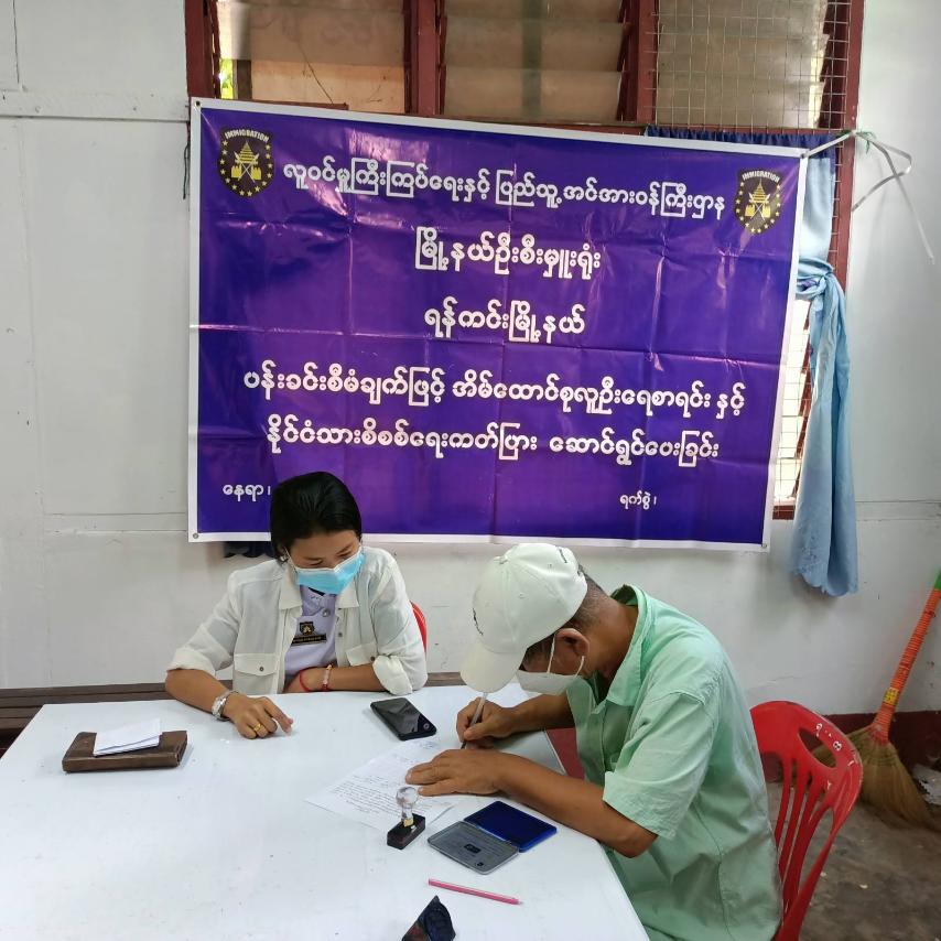 ရန်ကုန်တိုင်းဒေသကြီး၊ ရန်ကင်းမြို့နယ်တွင်လူဝင်မှုကြီးကြပ်ရေးနှင့် ပြည်သူ့အင်အားဝန်ကြီးဌာန မြို့နယ်ဦးစီးမှူးရုံးမှ မြို့နယ်အတွင်းရှိ ဒေသခံပြည်သူများအား လူနေမှုဘဝပြည့်စုံဖို့ နိုင်ငံသားကတ်ကိုင်ကြစို့ ပန်းခင်းစီမံချက်ဖြင့် နိုင်ငံသားစိစစ်ရေးကတ်မရရှိသေးသည့် ပြည်သူများနှင့် အိမ်ထောင်စုလူဦးရေစာရင်း ပြုလုပ်လိုသူများအား ရပ်ကွက်များအရောက် ကွင်းဆင်းပြုလုပ် ဆောင်ရွက်ပေးလျက်ရှိရာ ယနေ့နံနက်ပိုင်းက အမှတ်(၆)ရပ်ကွက် အုပ်ချုပ်ရေးမှူးရုံး၌ ပြုလုပ်ဆောင် ရွက်ပေးလျက် ရှိကြောင်းသိရသည်။