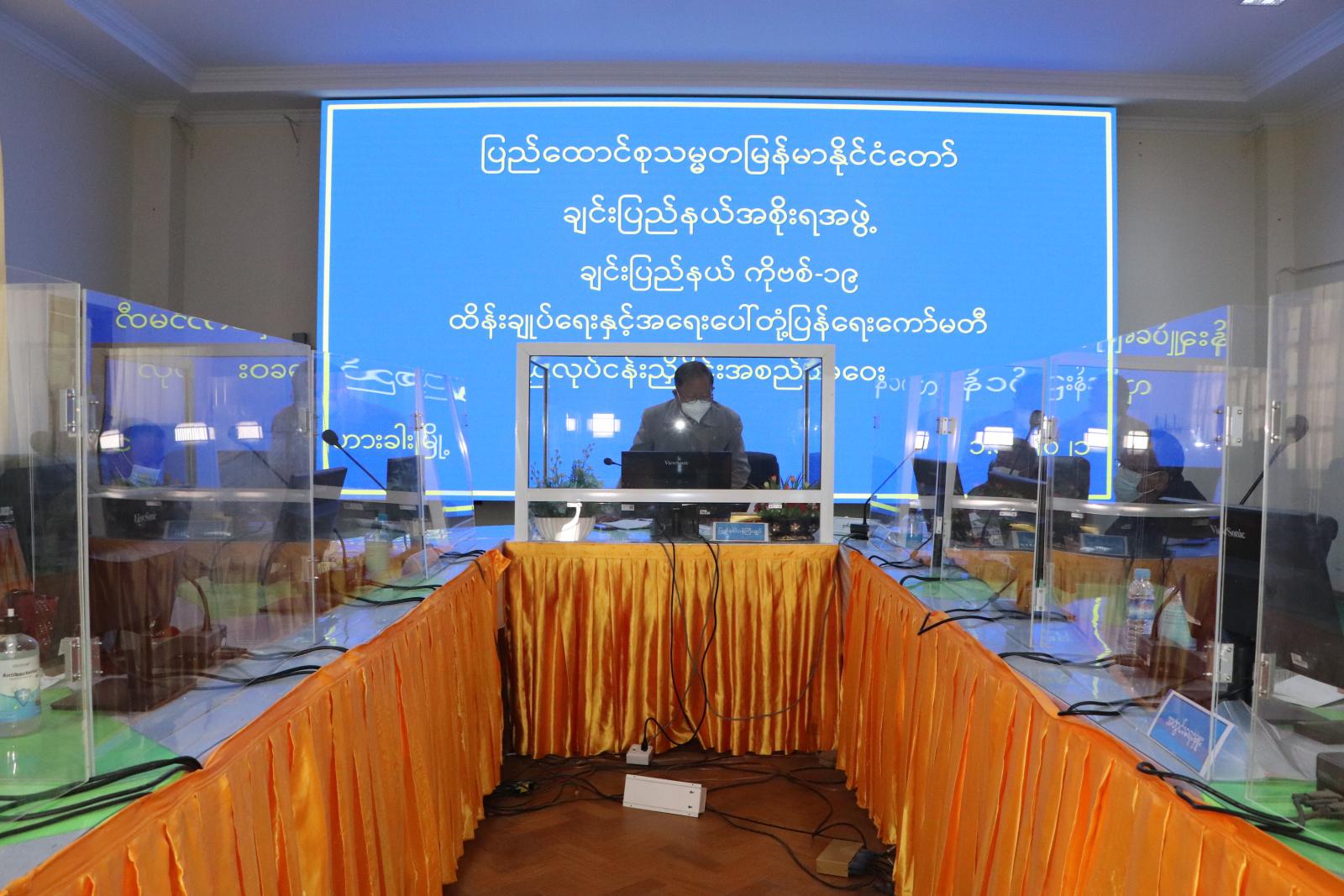 ယင်းနောက် တင်ပြချက်များအပေါ် လုံခြုံရေးနှင့်နယ်စပ်ရေးရာဝန်ကြီး ဗိုလ်မှူးကြီးဟန်ဝင်းအောင်၊ လမ်းပန်းဆက်သွယ်ရေးဝန်ကြီး ရဲမှူးကြီး စိုးလွင်မိုး၊ သယံဇာတရေးရာဝန်ကြီး ဦးကျော်ငြိမ်း၊ လူမှုရေးဝန်ကြီး ဦးသန့်ဇင်၊တိုင်းရင်းသားရေးရာဝန်ကြီး ဦးစိန်ထွန်းလှ၊ပြည်နယ် ဥပဒေချုပ်ဦးဆွန်ဒုတ် ကျင့်နှင့်ပြည်နယ် အစိုးရအဖွဲ့အတွင်းရေးမှူး ဦးမောင်မောင်ဆန်းတို့က ပြည်နယ်အတွင်း ကိုဗစ်−၁၉ တတိယလှိုင်းကို အတိုင်းအတာ တစ်ခုအထိ ထိန်းချုပ်ထားနိုင်ပြီဖြစ်သော်လည်း မပေါ့ဆရန်လိုအပ်မှု၊ ကိုဗစ်−၁၉ ရောဂါ ကာကွယ်ဆေးများ ဦးတည်အုပ်စုအလိုက် ရည်မှန်းဦးရေအတိုင်း အပြည့်အဝ ထိုးနှံနိုင်ရေးကိစ္စ၊RDT −Test kit ဖြင့် ရောဂါ ကာကွယ်ရေးလုပ်ငန်းများ ၊အသိပညာပေး လုပ်ငန်းများ အရှိန်အဟုန်မပျက် ဆက်လက်ဆောင်ရွက်ရန်ကိစ္စ များကို အကြံပြုဆွေးနွေးကြပြီး အနောက်မြောက်တိုင်းစစ်ဌာနချုပ် ဒုတိယတိုင်းမှူး ဗိုလ်မှူးချုပ် မျိုးထွဋ်လှိုင်နှင့် ပြည်နယ်ဝန်ကြီးချုပ်တို့က ပေါင်းစပ်ညှိနှိုင်းဆောင်ရွက်ပေးခဲ့ကာ ပြည်နယ်ဝန်ကြီးချုပ်က နိဂုံးချုပ် အမှာစကား ပြောကြားခဲ့ကြောင်း သိရသည်။