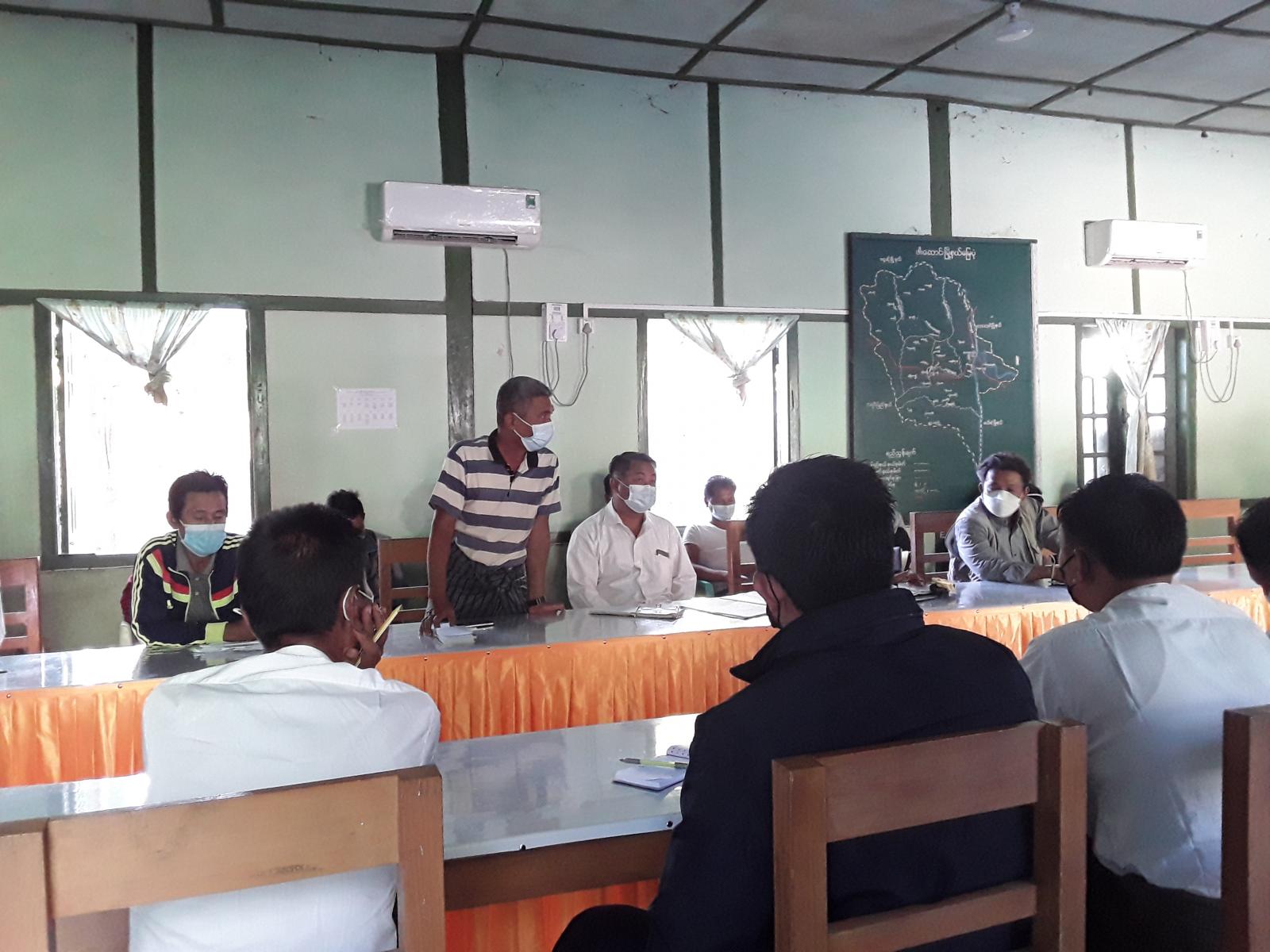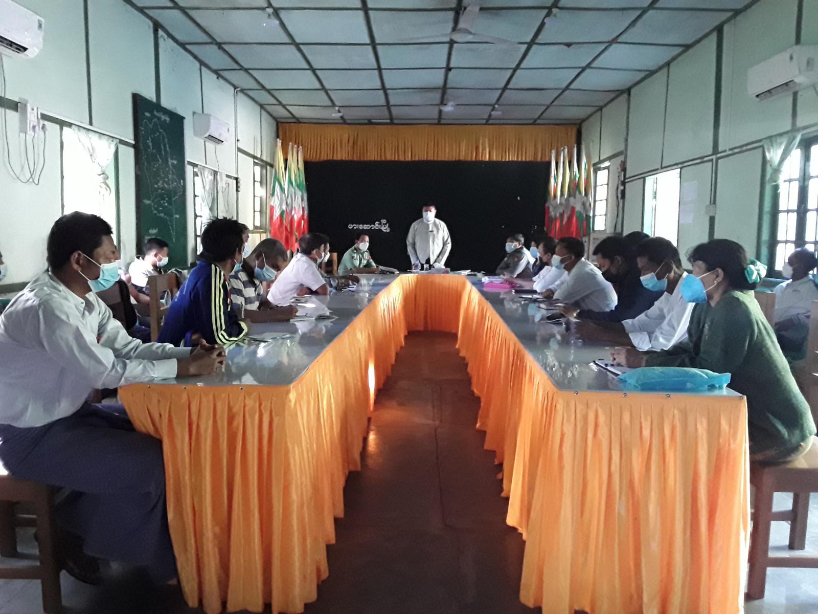 ရှေးဦးစွာ မြို့နယ်ကိုဗစ်-၁၉ ရောဂါ ထိန်းချုပ်ရေးနှင့် အရေးပေါ်တုံ့ပြန်ရေးကော်မတီဥက္ကဋ္ဌ မြို့နယ် အုပ်ချုပ်ရေးမှူး ဦးသက်မြင့်ဦးက မိမိတို့မြို့နယ်အတွင်း အသက်(၁၈)နှစ် အထက် လူဦးရေ (တစ်သောင်းခြောက်ထောင်) ကျော် ရှိသော်လည်း လူဦးရေ (ငါးထောင်) ကျော်ခန့်သာ ကိုဗစ်-၁၉ ကာကွယ်ဆေး ထိုးနှံပြီးဖြစ်၍ မြို့နယ်ဆေးထိုးရန် လူဦးရေနှင့် ကြည့်ပါက ၅၀ ရာခိုင်နှုန်း မပြည့်မီသေး ကြောင်း ၅၀ ရာခိုင်နှုန်းပြည့်မီရန်အတွက် ဌာနဆိုင်ရာတာဝန်ရှိသူများ ရပ်ကွက်၊ ကျေးရွာ အုပ်ချုပ်ရေး မှူးများက ဝိုင်းဝန်းပူးပေါင်း ဆောင်ရွက်ကြစေလိုကြောင်း ပြောကြားသည်။
