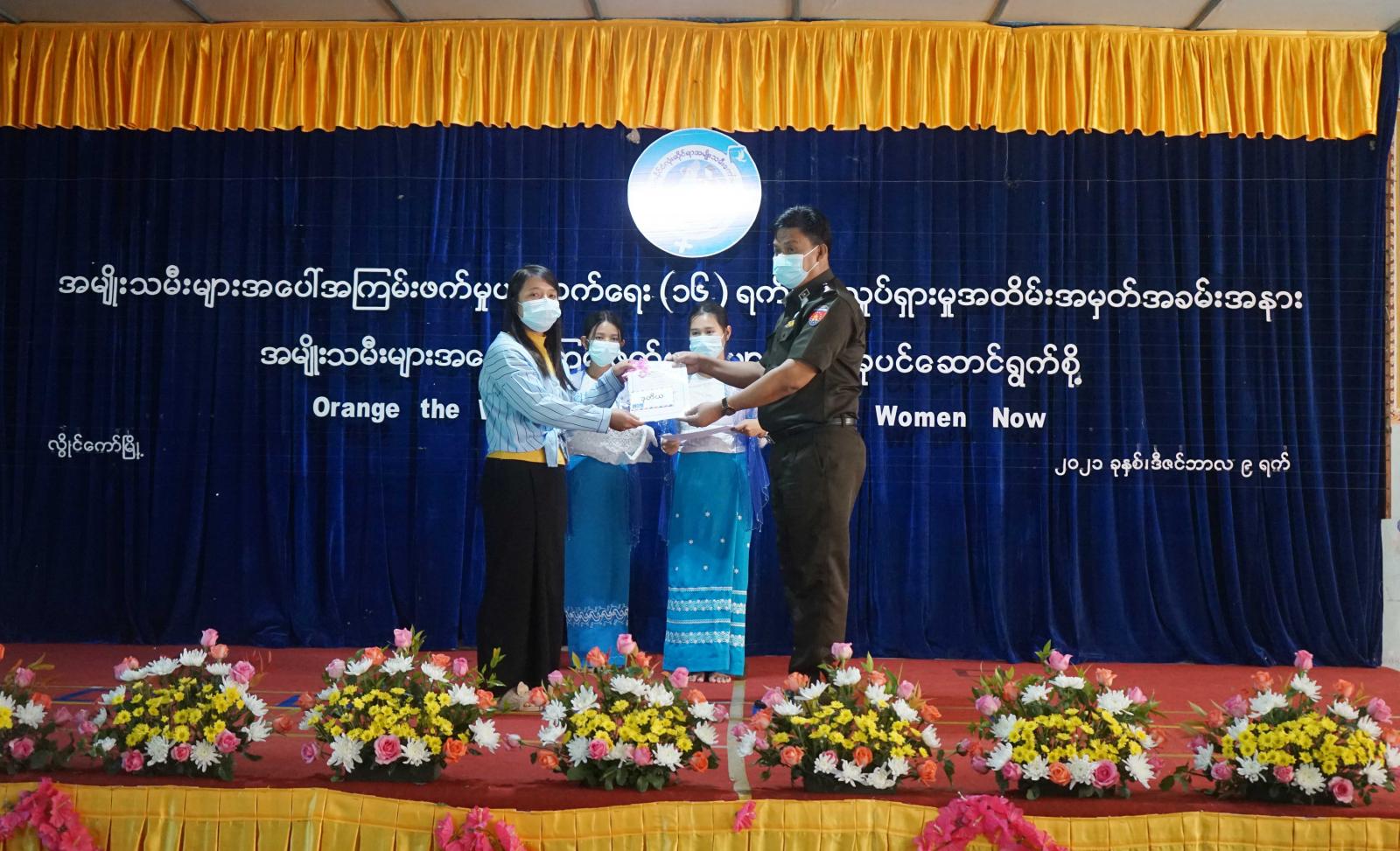 ထို့နောက် အမျိုးသမီးများအပေါ် အကြမ်းဖက်မှုပပျောက်ရေး အသိပညာပေး Video Clip ပြသပြီး ပန်းအလှပြိုင်ပွဲနှင့် အချက်အပြုတ်ပြိုင်ပွဲတို့တွင် ဆုရရှိသူများအား ကယားပြည်နယ် အမျိုးသမီး ကော်မတီဥက္ကဋ္ဌ၊ ကယားပြည်နယ်အစိုးရအဖွဲ့ဝင် လူမှုရေးရာဝန်ကြီးနှင့် တာဝန်ရှိသူတို့က ဆုများ ချီးမြှင့်ခဲ့ကြောင်း သိရသည်။