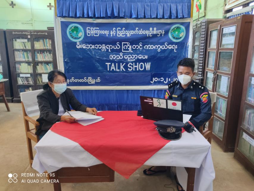 အဆိုပါ မီးဘေးအန္တရာယ်ကြိုတင် ကာကွယ်ရေးအသိပညာပေး Talk Show ဆောင်ရွက်ခြင်းကို ပြန်ကြားရေးနှင့်ပြည်သူ့ဆက်ဆံရေးဦးစီးဌာနမှ မြို့နယ်ဦးစီးမှူး ဒေါ်လဲ့ဝါမြင့်က Talk Show ပြုလုပ်ရခြင်း၏ ရည်ရွယ်ချက် ကို ရှင်းလင်းပြောကြားပြီး သိလိုသည်များကိုမေးမြန်ရာ မြို့နယ် မီးသတ် ဦးစီးဌာန မြို့နယ်ဦးစီးမှူး ဦးစိုးမိုးအောင်က မီးသတ်တပ်ဖွဲ့၏ ရည်ရွယ်ချက်နှင့် ရည်မှန်းချက် တာဝန်(၄)ရပ်၊မီးလောင်မှုအခြေအနေများနှင့်မီးလောင်မှု ဖြစ်ပွားလာပါက ဆက်သွယ်ရမည့် ဖုန်းနံပါတ်များအား ပြည်သူများသိရှိစေရန်စသည့် အကြောင်းအရာများကို ဆွေးနွေးခဲ့ကြသည်။