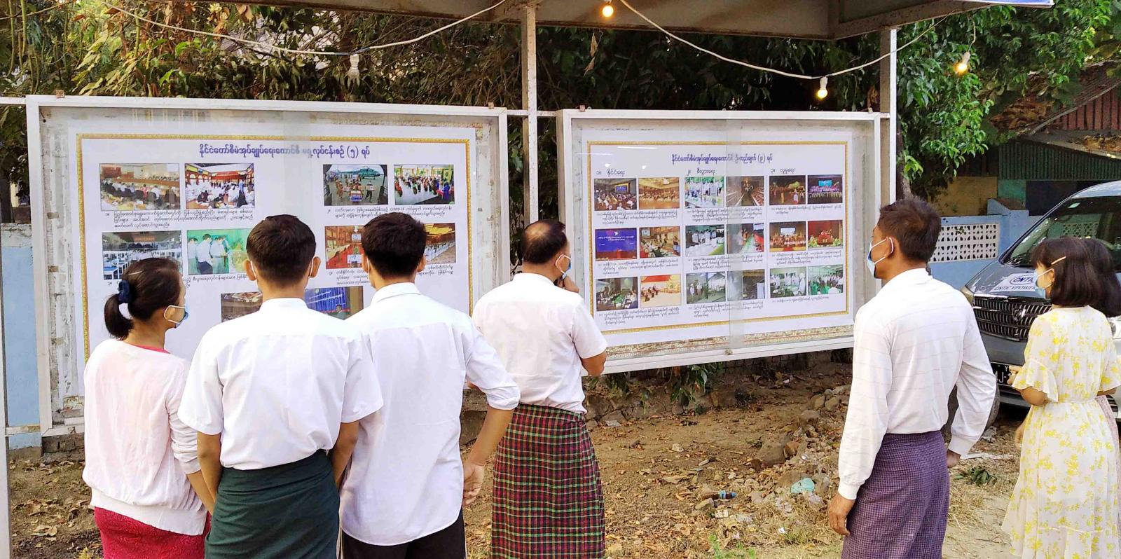 အဆိုပါ မြေစိုက်နံရံကပ်ပြဘုတ်တွင် နိုင်ငံတော်စီမံအုပ်ချုပ်ရေးကောင်စီအနေဖြင့် ရှေ့လုပ်ငန်းစဉ်(၅)ရပ်၊ ဦးတည်ချက် (၉)ရပ်ချမှတ်၍ အကောင်အထည်ဖော်ဆောင်ရွက် လျက်ရှိရာ ရှေ့လုပ်ငန်းစဉ်(၅)ရပ် လုပ်ငန်းများဆောင်ရွက်သည့် မှတ်တမ်း ဓာတ်ပုံများနှင့် ဦးတည်ချက်(၉)ရပ် တွင်ပါဝင်သော နိုင်ငံရေး၊ စီးပွားရေး၊ လူမှုရေး လုပ်ငန်းများ ဆောင်ရွက်သည့် မှတ်တမ်းပုံများပါဝင်သည့် ဗီနိုင်းပိုစတာဖြင့် အများပြည်သူများ လေ့လာဖတ်ရှု သိရှိနိုင်စေရေး ဝေဝေဆာဆာပြသထား သည်။