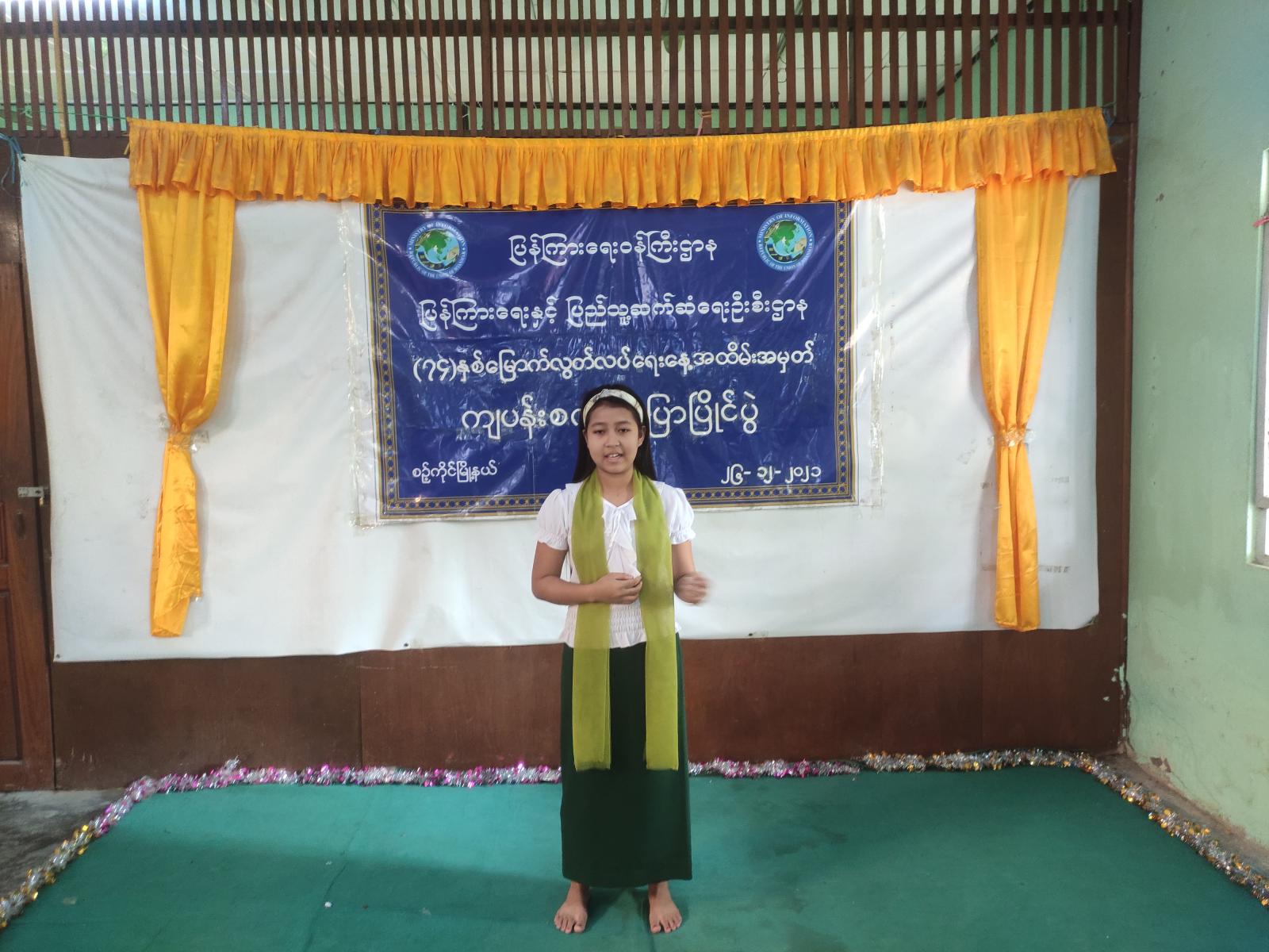 မန္တလေးတိုင်းဒေသကြီး၊ ကျောက်ဆည်ခရိုင်၊ စဉ့်ကိုင်မြို့နယ် ပြန်ကြားရေးနှင့်ပြည်သူ့ဆက်ဆံရေးဦးစီးဌာန ပြည်သူ့စာကြည်တိုက် လူထုအခြေပြုဗဟိုဌာန ( Community Centre )တွင် ( ၇၄)နှစ်မြေှာက် လွတ်လပ်ရေးနေ့အထိမ်းအမှတ်အကြို အလယ်တန်းအဆင့် ကျပန်းစကားပြောပြိုင်ပွဲကို ယနေ့နံနက် (၁၀)နာရီက ကျင်းပပြုလုပ်ခဲ့ကြောင်းသိရသည်။