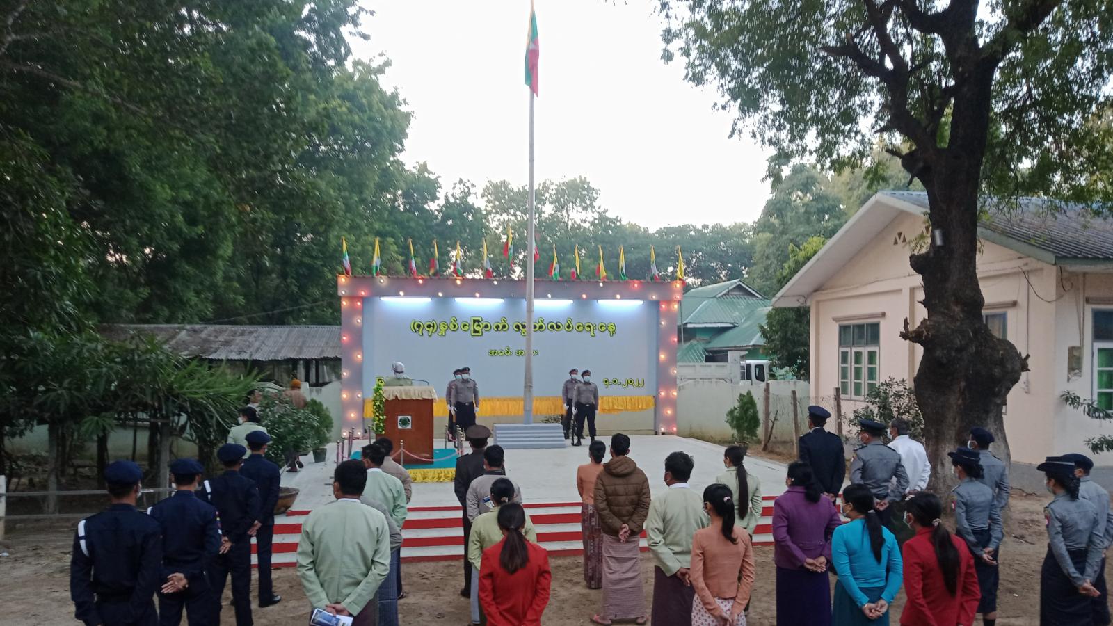 ပြည်တောင်စုသမ္မတမြန်မာနိုင်ငံတော်၏၂၀၂၂ ခုနှစ် ဇန်နနဝါရီလ(၄)ရက်နေ့တွင် ကျရောက်သည့် (၇၄)နှစ်မြောက် လွတ်လပ်ရေးနေ့ အလံတင်အခမ်းအနားနှင့် နိုင်ငံတော် စီမံအုပ်ချုပ်ရေး ကောင်စီဥက္ကဋ္ဌနိုင်ငံတော်ဝန်ကြီးချုပ် ဗိုလ်ချုပ်မှူးကြီး မင်းအောင်လှိုင်ထံမှ ပေးပို့သည့် သဝဏ်လွှာ ဖတ်ကြားခြင်း အခမ်းအနားကို စစ်ကိုင်းတိုင်းဒေသကြီး၊ စစ်ကိုင်းခရိုင် မြင်းမူမြို့ အထွေထွေ အုပ်ချုပ်ရေးဦးစီးဌာနရုံးတွင် ယနေ့နံနက်ပိုင်းက ကျင်းပပြုလုပ်ခဲ့သည်။