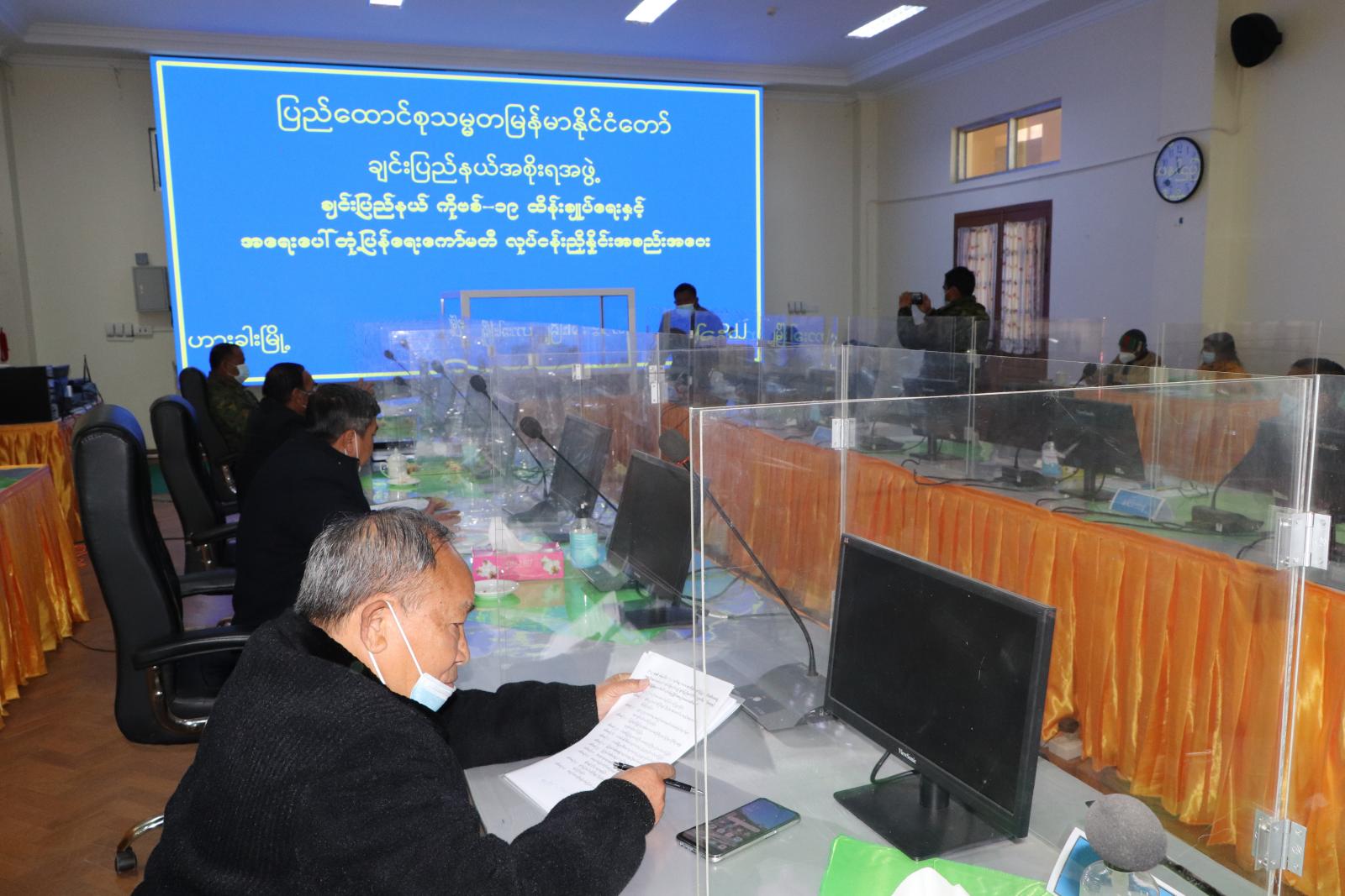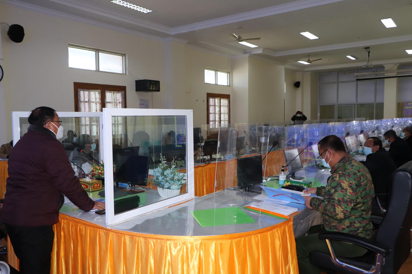 ထို့နောက် တင်ပြချက်များအပေါ် လုံခြုံရေးနှင့်နယ်စပ်ရေးရာဝန်ကြီး ဗိုလ်မှူးကြီး ဟန်ဝင်းအောင်၊ သယံဇာတရေးရာဝန်ကြီး ဦးကျော်ငြိမ်း၊ လမ်းပန်းဆက်သွယ်ရေးဝန်ကြီး၊ ရဲမှူကြီး စိုးလွင်မိုး၊ ပြည်နယ်ဥပဒေချုပ် ဦးဆွန်ဒုတ်ကျင့်နှင့် ပြည်နယ်အစိုးရအဖွဲ့အတွင်းရေးမှူး ဦးမောင်မောင်ဆန်းတို့က မြို့နယ်အလိုက် ကိုဗစ်-၁၉ ကာကွယ်ဆေးပစ္စည်းလိုအပ်ချက်၊ ပြည်နယ်အတွက် ရရှိသည့်ဆေးဝါးများ သယ်ယူနိုင်မည့်အခြေအနေ၊ ထပ်မံမှာယူသည့် ၄၀ လီတာ အောက်ဆီဂျင်အိုးများ ရောက်ရှိမှု၊ မြို့နယ်(၉)မြို့နယ်အတွက် ကိုဗစ်-၁၉ ကာကွယ်ကုသဆေးများ ဝယ်ယူနိုင်ရေး လျာထားဆောင်ရွက်မှု၊ ကိုဗစ်-၁၉ ရောဂါပိုး ရှာဖွေစစ်ဆေးမှုကို အရှိန်အဟုန်မပြတ် ဆက်လက်ဆောင်ရွက်ရန် လိုအပ်မှုနှင့် ဆရာဝန်လိုအပ်ချက်များ ဖြည့်ဆည်းပေးနိုင်မည့် အခြေအနေများကို အကြံပြုဖြည့်စွက်ဆွေးနွေးကြပြီး ပြည်နယ် ဝန်ကြီးချုပ်နှင့် အနောက်မြောက်တိုင်းစစ်ဌာနချုပ် ဒုတိယတိုင်းမှူး ဗိုလ်မှူးချုပ် မျိုးထွဋ်လှိုင်တို့က ညှိနှိုင်းဆောင်ရွက်ပေးကာ ပြည်နယ်ဝန်ကြီးချုပ်က နိဂုံးချုပ်အမှာစကား ပြောကြားခဲ့ကြောင်းသိရသည်။