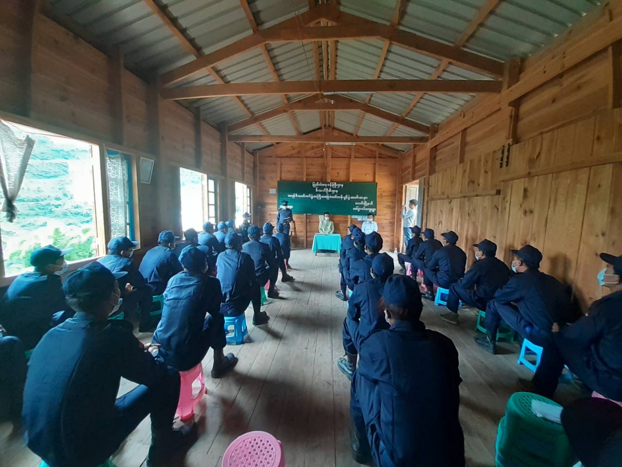 သင်တန်းဖွင့်ပွဲ အခမ်းအနားတွင် ဖလမ်းမြို့နယ် မီးသတ်ဦးစီးမှူး ဦးဘွေမောင်းထန် က သင်တန်းဖွင့်လှစ်ရခြင်း ရည်ရွယ်ချက်များကို ရှင်းလင်းပြောကြားသည်။