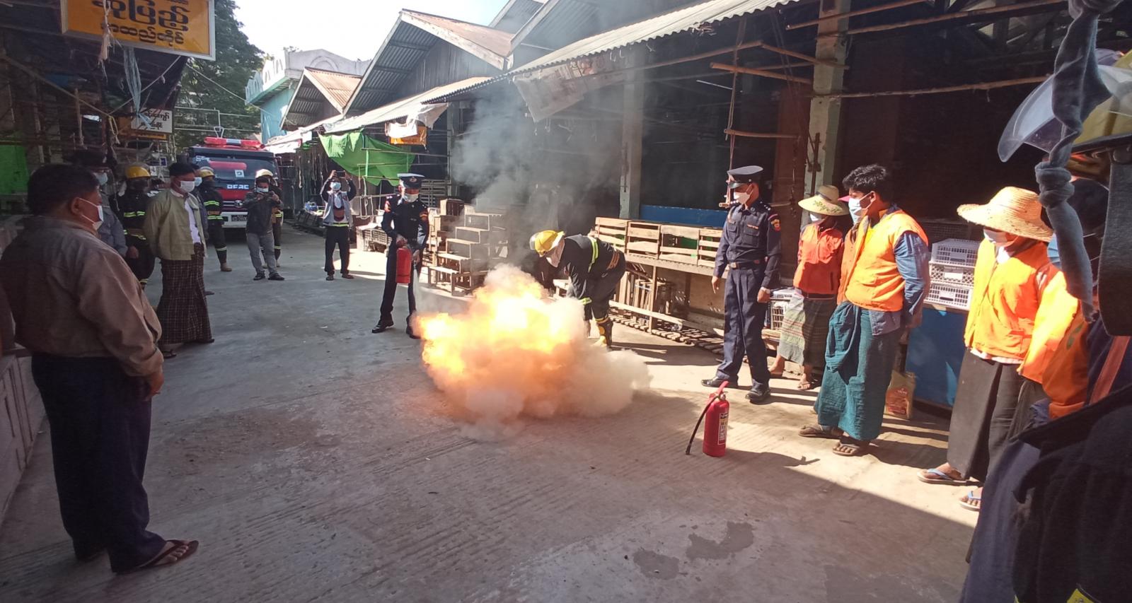 ယခုကဲ့သို့ ဈေးသူဈေးသားများကို လက်တွေ့မီးငြိမ်းသတ်ခြင်းပြသပေးခြင်းဖြစ်ကြောင်း၊ မီးငြိမ်းသတ်ရာတွင် ဆီမီးလောင်ခြင်းကို ရေစိုအဝတ်ဖြင့်ဖုံး အုပ်ငြိမ်းသတ်ခြင်း၊ မီးသတ် ဆေးဘူးကို ကျွမ်းကျင်စွာကိုင်တွယ်ငြိမ်းသတ်နိုင်ရေးတို့အတွက် မြို့နယ်မီးသတ်တပ်ဖွဲ့များ၊ သန္ဓေတပ်ဖွဲ့ ဝင်များပူးပေါင်း ဆောင်ရွက်ခြင်းဖြစ်ကြောင်း၊ ယင်းအပြင်မီးသတ် ရေယာဉ်များဖြင့်လက်တွေ့ မီးငြိမ်းသတ်ခြင်းကိုလည်း လက်တွေ့ပြသပေးခဲ့ကြောင်း ၊ မြို့နယ် မီးသတ်ဦးစီးမှူး ဦးကျော်ကျော်ဦးထံမှသိရှိရသည်။