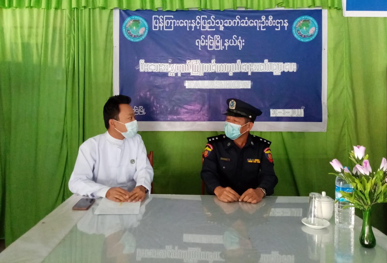 ရခိုင်ပြည်နယ်၊ ရမ်းဗြဲမြို့နယ်၊ ပြန်ကြားရေးနှင့်ပြည်သူ့ဆက်ဆံရေးဦးစီးဌာန၊ လူထုအခြေပြုဗဟို ဌာန (Communty Centre)ခန်းမ၌ မြို့နယ်မီးသတ်ဦးစီးဌာနနှင့်ပူးပေါင်းပြီး ပြည်သူများသို့ မီးဘေးအန္တရာယ်ကြိုတင်ကာကွယ်ရေးအသိပညာပေး TALKSHOW ဆောင်ရွက်မှုကို ယနေ့ မွန်းလွဲ ၁ နာရီက ဆောင်ရွက်ခဲ့ကြကြောင်းသိရသည်။