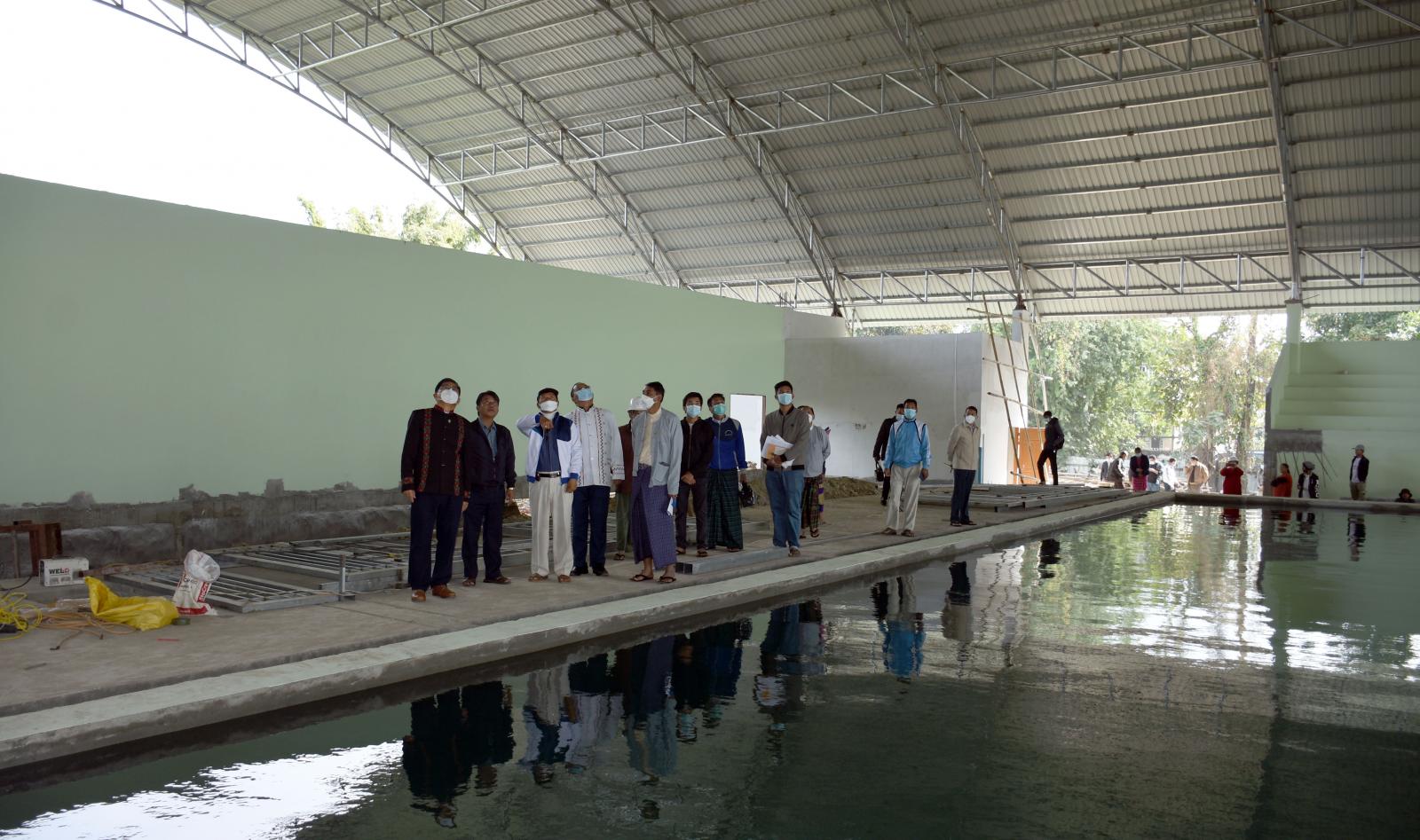 ရှေးဦးစွာ ပြည်နယ်ဝန်ကြီးချုပ်သည် ပြည်နယ်ဝန်ကြီးများ၊ ပြည်နယ်အဆင့်ဌာနဆိုင်ရာ တာဝန်ရှိသူများနှင့်အတူ မြစ်ကြီးနားမြို့ သီတာရပ်ကွက်ရှိ ပြည်နယ်အားကစားနှင့်ကာယပညာဦးစီးဌာနမှ ဆောင်ရွက်လျက်ရှိသည့် ရေကူးပြေးလမ်း ၁၀ လမ်းပါ (အလျား ၅၀ မီတာ၊ အနံ ၂၅ မီတာ) ရှိ ရေကူးကန်တည်ဆောက်နေမှုလုပ်ငန်းခွင်အတွင်း ပွဲကြည့်စင်ဆောက်လုပ်နေမှု၊ အမိုးဒိုင်းများ တည်ဆောက်ထားရှိမှု အခြေအနေတို့ကို လှည့်လည်ကြည့်ရှု စစ်ဆေးခဲ့ကြကာ ပြည်နယ်ဝန်ကြီးချုပ်က စံချိန်စံညွှန်းနှင့် အရည်အသွေးပြည့်မီအောင် ဆောက်လုပ် သွားရေးတာဝန်ရှိသူများအား မှာကြားခဲ့သည်။