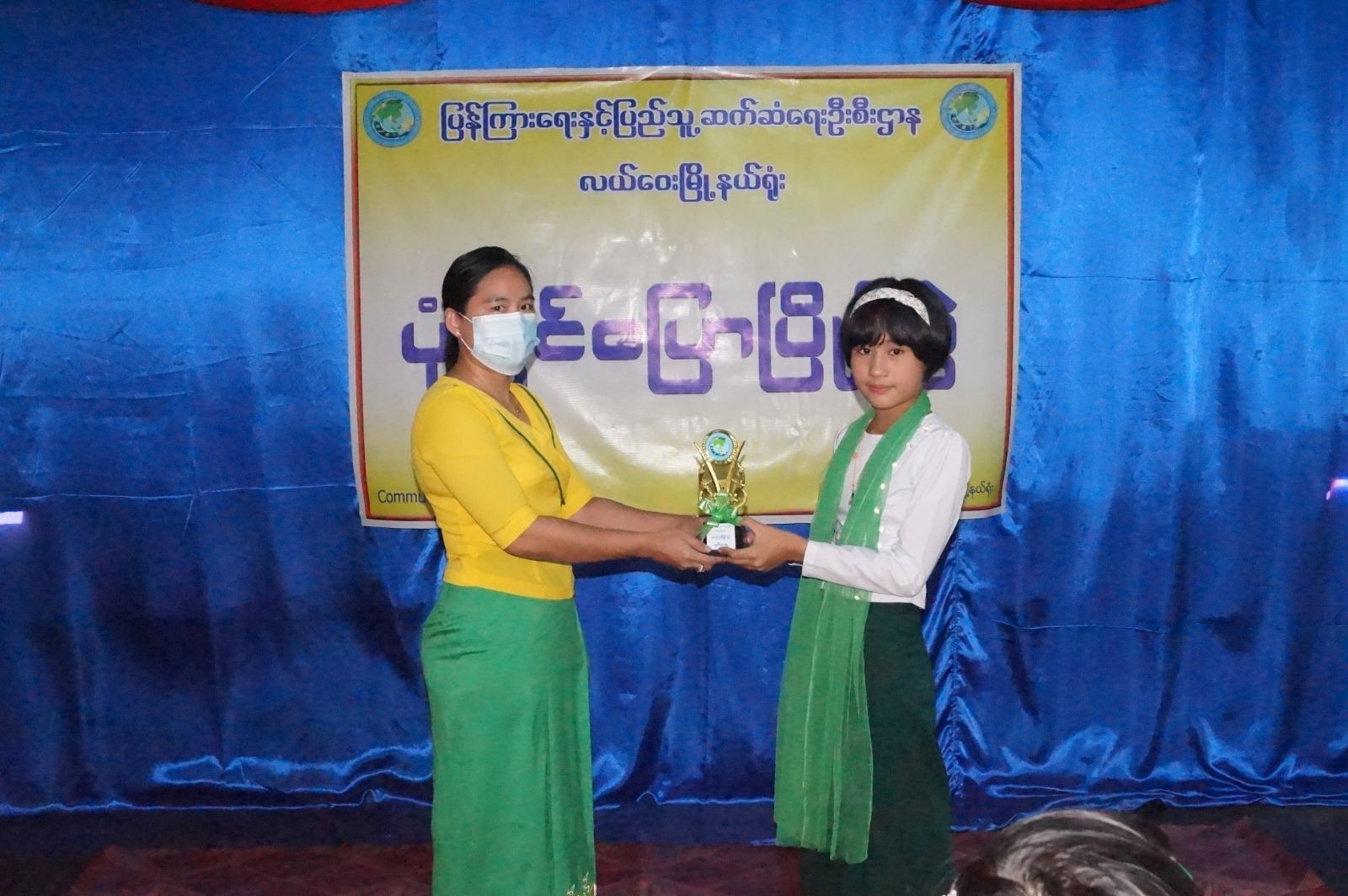 ထို့နောက် မူလတန်း (အထက်ဆင့်) ပုံပြင်ပြောပြိုင်ပွဲတွင် ပထမဆုရရှိသည့် မခင်ဟံသာ၊ ဒုတိယဆုရရှိသည့် မအိမ့်သူသူဟန်၊ တတိယဆုရရှိသည့် မခွန်းချိုလင်းတို့အား မြို့နယ်ဦးစီးမှူး ဒေါ်ဝေကြည်စန်းအောင်၊ မြို့နယ်စီမံကိန်းဦးစီးမှူး ဒေါ်သိန်းသိန်းနှင့် လက်ထောက်တိုင်းရင်း ဆေးမှူး ဒေါ်နန်းမွန်အေးတို့က ဆုများပေးအပ်ချီးမြှင့်ခဲ့ကြကြောင်း သိရသည်။