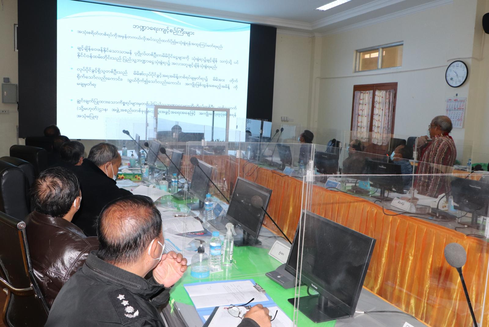 ထို့နောက် အစည်းအဝေးသို့ တက်ရောက်လာကြသည့် ပြည်နယ်အဆင့် ဌာနဆိုင်ရာတာဝန်ရှိသူ များက ၂၀၂၁ခုနှစ်၊ အောက်တိုဘာလမှ ၂၀၂၂ခုနှစ်၊ မတ်လအထိ (၆) လအတွင်း ပြည်ထောင်စု/ ပြည်နယ် ငွေလုံးငွေရင်းခွင့်ပြုငွေဖြင့် ဆောင်ရွက်သည့် လုပ်ငန်းများနှင့်ပတ်သက်၍ ခွင့်ပြုသည့်လုပ်ငန်းအရေအတွက်၊ တင်ဒါခေါ်ယူသည့်လုပ်ငန်း၊ ဌာနအစီအစဖြင့် ဆောင်ရွက်သည့်လုပ်ငန်းများ၏ ဆောင်ရွက်ပြီးစီးမှုအခြေအနေ၊ နယ်မြေဒေသအခြေအနေအရ ဆောင်ရွက်နိုင်ခြင်း မရှိသည့်လုပ်ငန်းများ ပြန်လည်အပ်နှံရေး ဆောင်ရွက်ထားရှိမှုအခြေအနေများကို Power Point ဖြင့် အသီးသီး ရှင်းလင်းတင်ပြကြသည်။