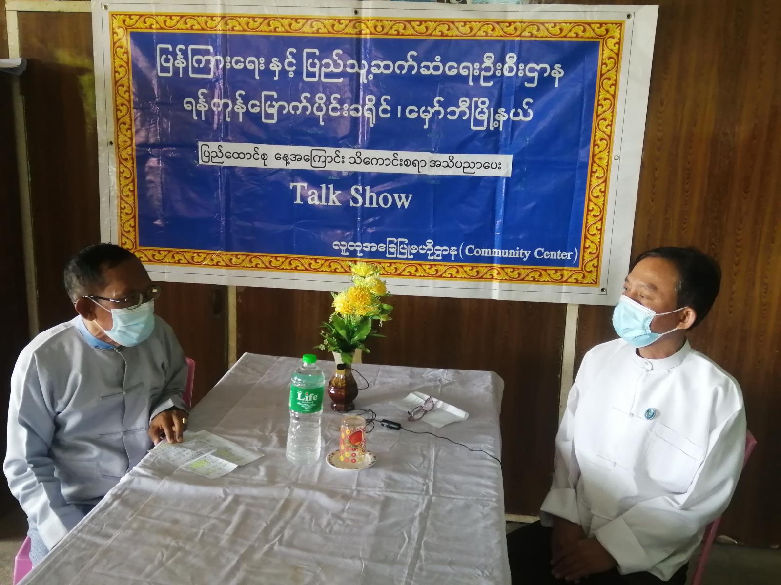 ရန်ကုန်တိုင်းဒေသကြီး၊ မြောက်ပိုင်းခရိုင်၊ မှော်ဘီမြို့နယ်တွင် ပြန်ကြားရေးနှင့်ပြည်သူ့ဆက်ဆံရေးဦးစီးဌာနနှင့် မှော်ဘီမြို့နယ် စာပေချစ်သူများ အသင်း(Book Club) တို့ပူးပေါင်း၍ ပြည်ထောင်စုနေ့ အကြောင်း သိကောင်း စရာ အသိပညာပေး Talk Show အစီအစဉ်ကို ယနေ့ နံနက် ၉:၀၀နာရီ အချိန်ကပြန်ကြားရေးနှင့်ပြည်သူ့ဆက်ဆံရေးဦးစီးဌာန Community Center ခန်းမ၌ ကိုဗစ်-၁၉ ရောဂါ ကာကွယ်ရေး လမ်းညွှန်စည်းကမ်းချက်များနှင့် အညီ ကျင်းပခဲ့ကြောင်းသိရသည်။