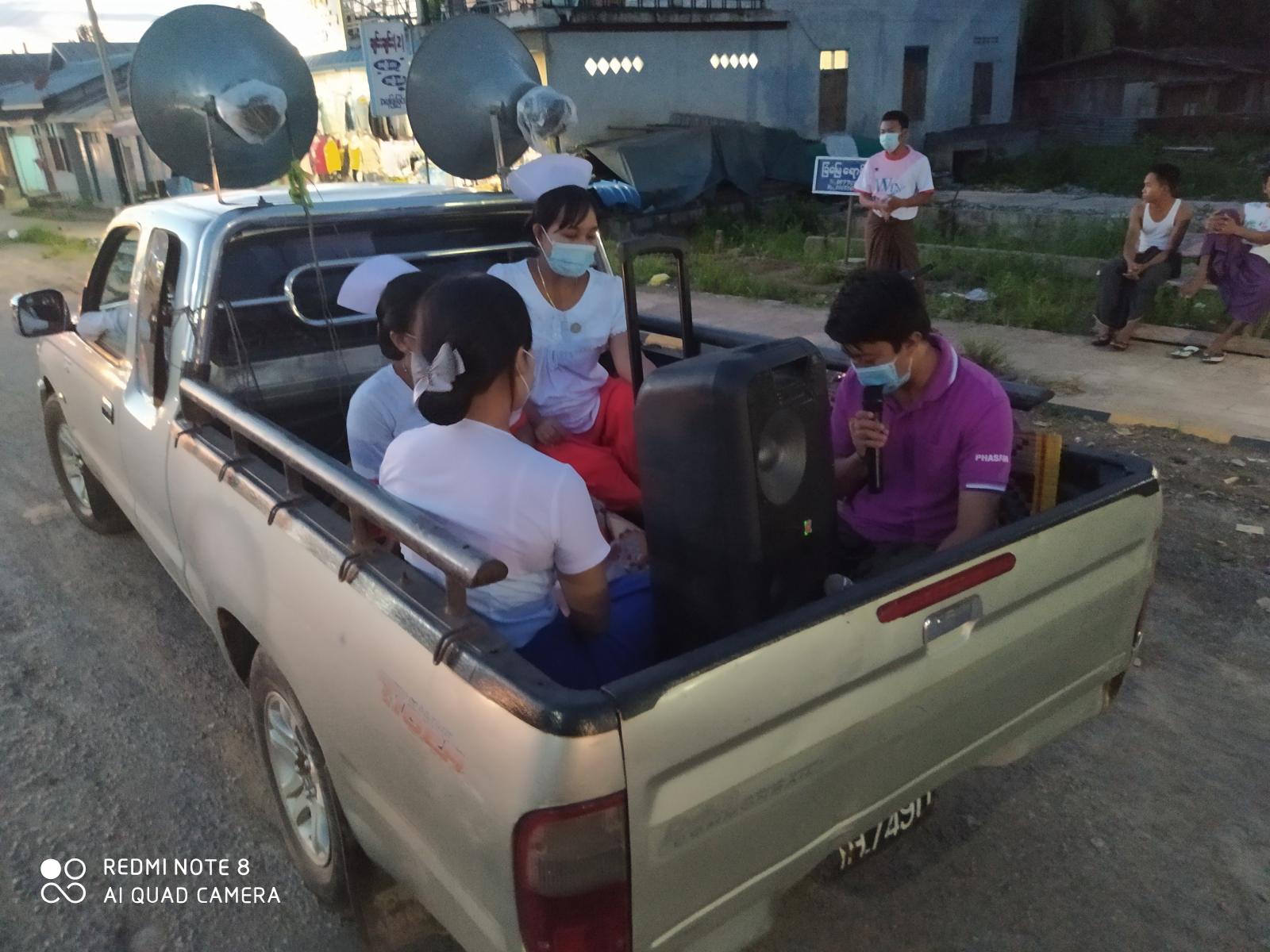 ကရင်ပြည်နယ်၊ ကော့ကရိတ်ခရိုင်၊ ဘုရာသုံးဆူမြို့တွင် ကိုဗစ် − ၁၉ ရောဂါ ကြိုတင်ကာကွယ်ရေးလုပ်ငန်းများအား ပြည်သူများသိရှိနိုင်ရေးအတွက် ကျေးလက်ကျန်းမာရေးဌာနမှ ရပ်ကွက်အတွင်းသို့ အသံချဲ့စက်များဖြင့် ယမန်နေ့ညနေ ၅ နာရီအချိန်တွင် ကွင်းဆင်းဆောင်ရွက်ခဲ့သည်။