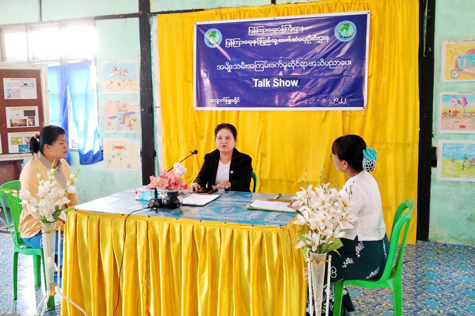 ရှေးဦးစွာ ကျောက်ဖြူခရိုင်ပြန်ကြားရေးနှင့်ပြည်သူ့ဆက်ဆံရေးဦးစီးဌာန၊ ဒေါ်အောင်တင်ကြည် (ဦးစီးအရာရှိ၊တာဝန်ပေး)က အသိပညာပေး Talk Show ကျင်းပရခြင်းနှင့် ပတ်သက်၍ ရှင်းလင်းပြော ကြားခဲ့ပြီး၊ ခရိုင်လူမှုဝန်ထမ်းဦးစီးဌာန၊ ဒုတိယညွှန်ကြားရေးမှူး ဒေါ်ခင်နွယ်ထွန်းက အမျိုးသမီးအကြမ်းဖက်ခံရပါက ဆက်သွယ်အကူအညီ တောင်းခံနိုင်မည့်နည်းလမ်းများ၊ အမျိုးသမီး များနှင့် ပတ်သက်၍ ဥပဒေပြဌာန်းထားရှိမှုများအား ပြောကြားဆွေးနွေးခဲ့သည်။