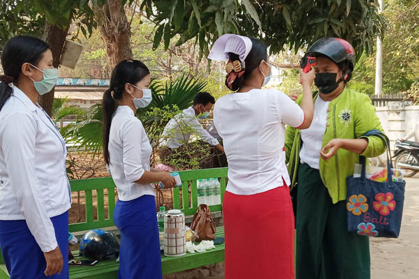 အဆိုပါ ကိုယ်အပူချိန်တိုင်းတာစစ်ဆေးခြင်းနှင့် ပညာပေးလက်ကမ်းများ ဝေငှခြင်းတို့ကို မြို့နယ်ကြီးကြပ်မှု ကော်မတီမှ လူငယ်အဖွဲ့ဝင်(၁၂)ဦး၊ ကျန်းမာရေးဌာနမှ သူနာပြု(၃)ဦးနှင့် ပြန်/ဆက်ဦးစီးဌာန၊ မြို့နယ်စည်ပင် သာယာရေးအဖွဲ့တို့မှ ဝန်ထမ်းများနှင့် ပူးပေါင်း၍ မွန်းတည့်(၁၂)နာရီအထိ ဆောင်ရွက်ခဲ့ခြင်းဖြစ်ကြောင်း သိရသည်။