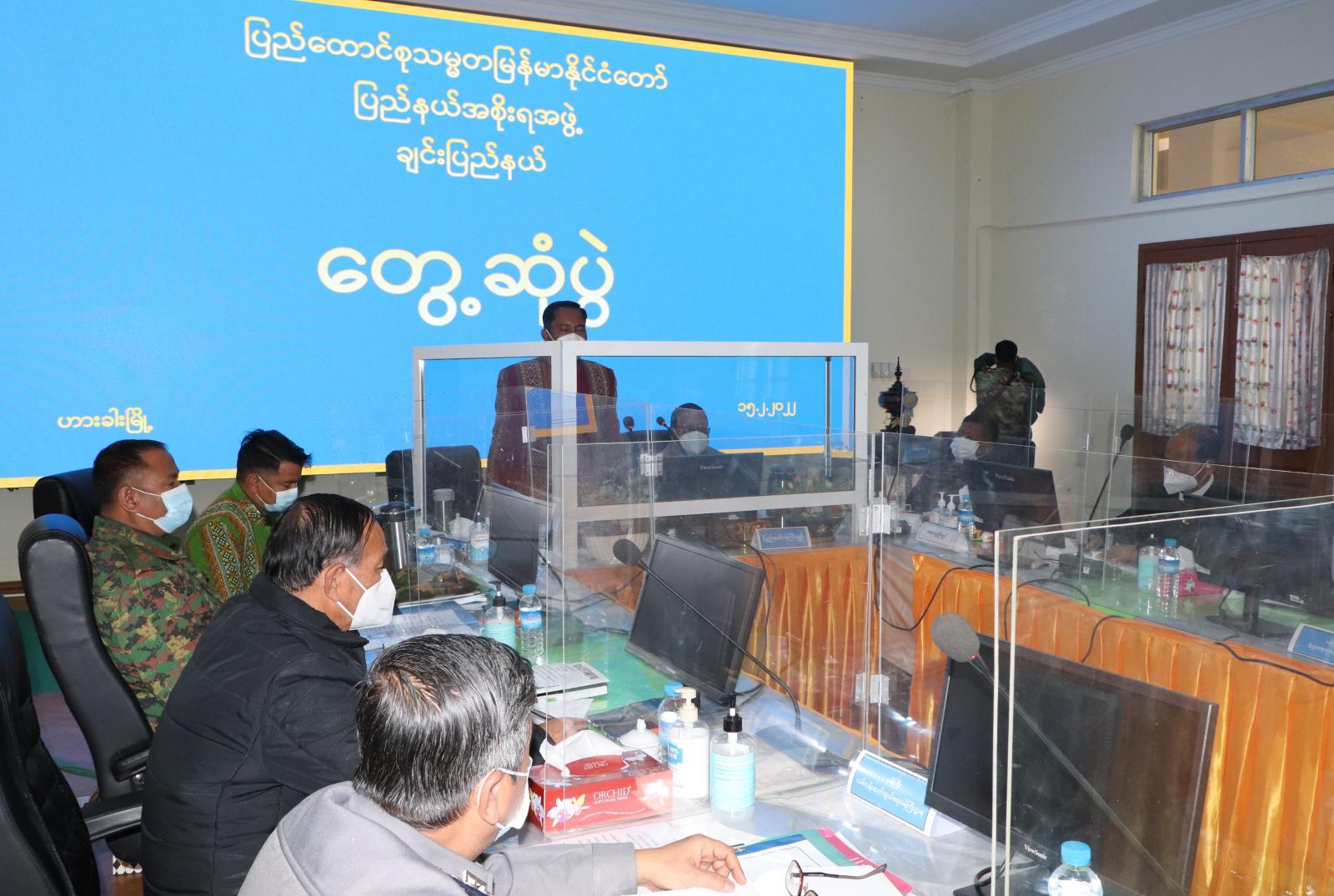 ထို့နောက် အနောက်မြောက်တိုင်းစစ်ဌာနချုပ် တိုင်းမှူး ဗိုလ်မှူးချုပ် သန်းထိုက်က ချင်းပြည်နယ် တည်ငြိမ်အေးချမ်းရေးအတွက် အားလုံးပူးပေါင်း ဆောင်ရွက်ရန် လိုအပ်မှု၊ တည်ငြိမ်မှုနှင့် လုံခြုံရေးဆိုင်ရာများကို လမ်းညွှန်ဆွေးနွေးပြီး ဒေသကွပ်ကဲမှုစစ်ဌာနချုပ်(ကလေး) ဗိုလ်မှူးချုပ် သန့်ဇင်ဦး က ကိုဗစ်-၁၉ ရောဂါ ကာကွယ်ဆေး၊ ကိုဗစ်-၁၉ ရောဂါကာကွယ်ရေးပစ္စည်းများ ရဟတ်ယာဉ်ဖြင့် သယ်ယူပို့ဆောင်ပေးမှုအခြေ အနေများကို ရှင်းလင်းဆွေးနွေးသည်။