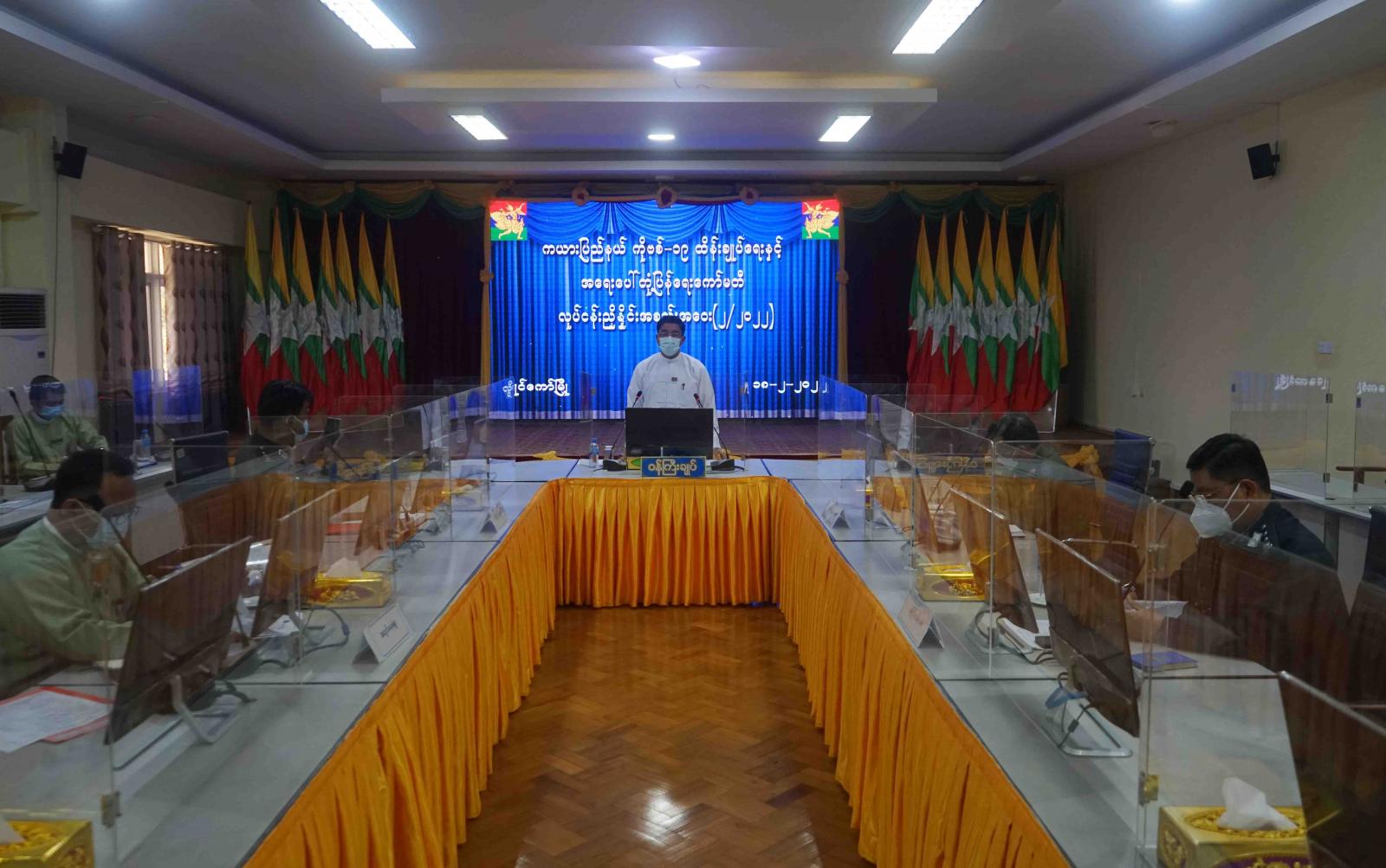 ကယားပြည်နယ် ကိုဗစ်-၁၉ ထိန်းချုပ်ရေးနှင့် အရေးပေါ်တုံ့ပြန်ရေး ကော်မတီ လုပ်ငန်းညှိနှိုင်း အစည်းအဝေး (၂/၂၀၂၂)ကို ယနေ့ နံနက် ၉ နာရီအချိန်က ကယားပြည်နယ် အစိုးရအဖွဲ့ရုံး အစည်းအဝေးခန်းမ၌ ကျင်းပခဲ့သည်။