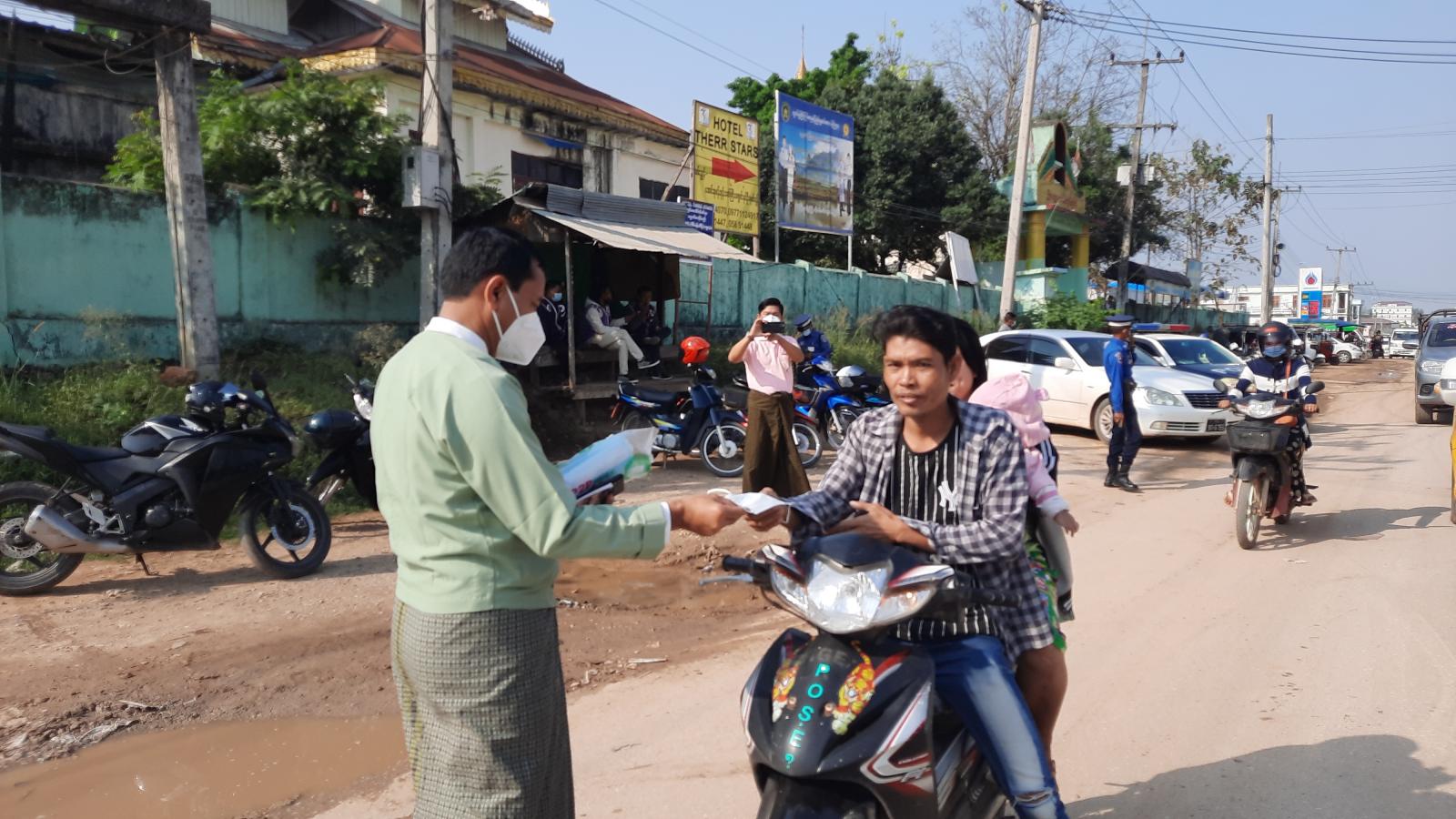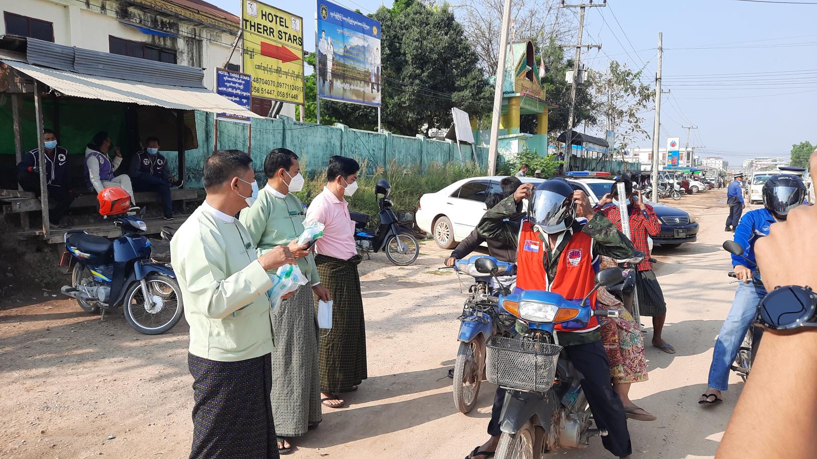ထိုသို့ ဆောင်ရွက်ရာ မြဝတီခရိုင်စီမံအုပ်ချုပ်ရေးအဖွဲ့ ဥက္ကဋ္ဌ ခရိုင်အုပ်ချုပ်ရေးမှူး ဦးစိုးတင့်၊ အဖွဲ့ဝင် ဦးစိန်သောင်းနှင့် အဖွဲ့ဝင်များ၊ မြဝတီခရိုင်ရဲတပ်ဖွဲ့မှူး ဒုတိယရဲမှူးကြီး အောင်မြင့်ဌေး၊ လူဝင်မှုကြီးကြပ်ရေးနှင့်ပြည်သူ့ အင်အားဆိုင်ရာ ခရိုင်ဦးစီးမှူးရုံးမှ ခရိုင်ဦးစီးဌာနမှူး ဦးရဲဇင်လတ်၊ မြို့နယ်စီမံအုပ်ချုပ်ရေး အဖွဲ့ဥက္ကဋ္ဌ မြို့နယ်အုပ်ချုပ်ရေးမှူး ဦးသက်လွင်၊ အဖွဲ့ဝင် ဦးအောင်မင်းစိုးနှင့် အဖွဲ့ဝင်များ၊ မြို့နယ် ရဲတပ်ဖွဲ့မှူး ရဲမှူး မျိုးမင်းဇော်နှင့် တပ်ဖွဲ့ဝင်များ၊ မြဝတီ ဖောင်ဒေးရှင်းအဖွဲ့မှ တာဝန်ရှိသူများနှင့်အဖွဲ့ဝင် များက ပြည်သူများအား Mask များအခမဲ့ပေးဝေပြီး အသိပညာပေးခြင်းများ ဆောင်ရွက်ခြင်းဖြစ်သည်။