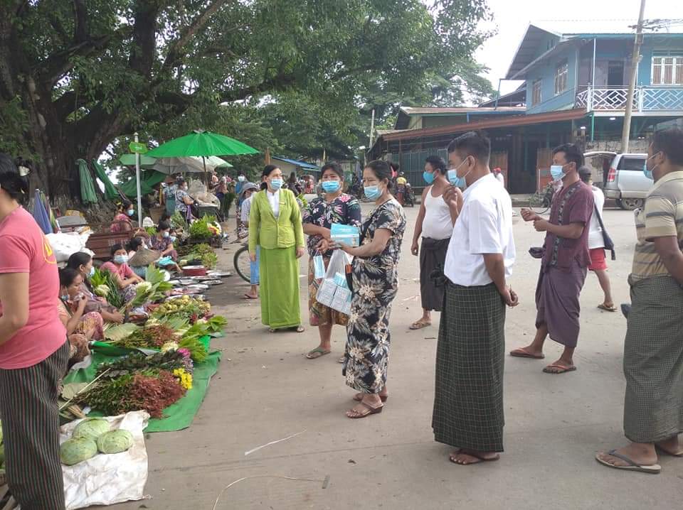 ကချင်ပြည်နယ်၊ ဗန်းမော်မြို့နယ် ကမ်းနားလမ်းယာယီပျံကျဈေးတွင် ကိုဗစ်-၁၉ ကြိုတင် ကာကွယ်နိုင်ရေးအတွက် လူတိုင်းကိုယ်စီ Mask တပ်ဆင်ရေး အသိပညာပေးပြောကြားပြီး Mask များအခမဲ့ ဖြန့်ဝေပေးခြင်းကို ယနေ့နံနက် ၆ နာရီခွဲက ဆောင်ရွက်ခဲ့သည်။