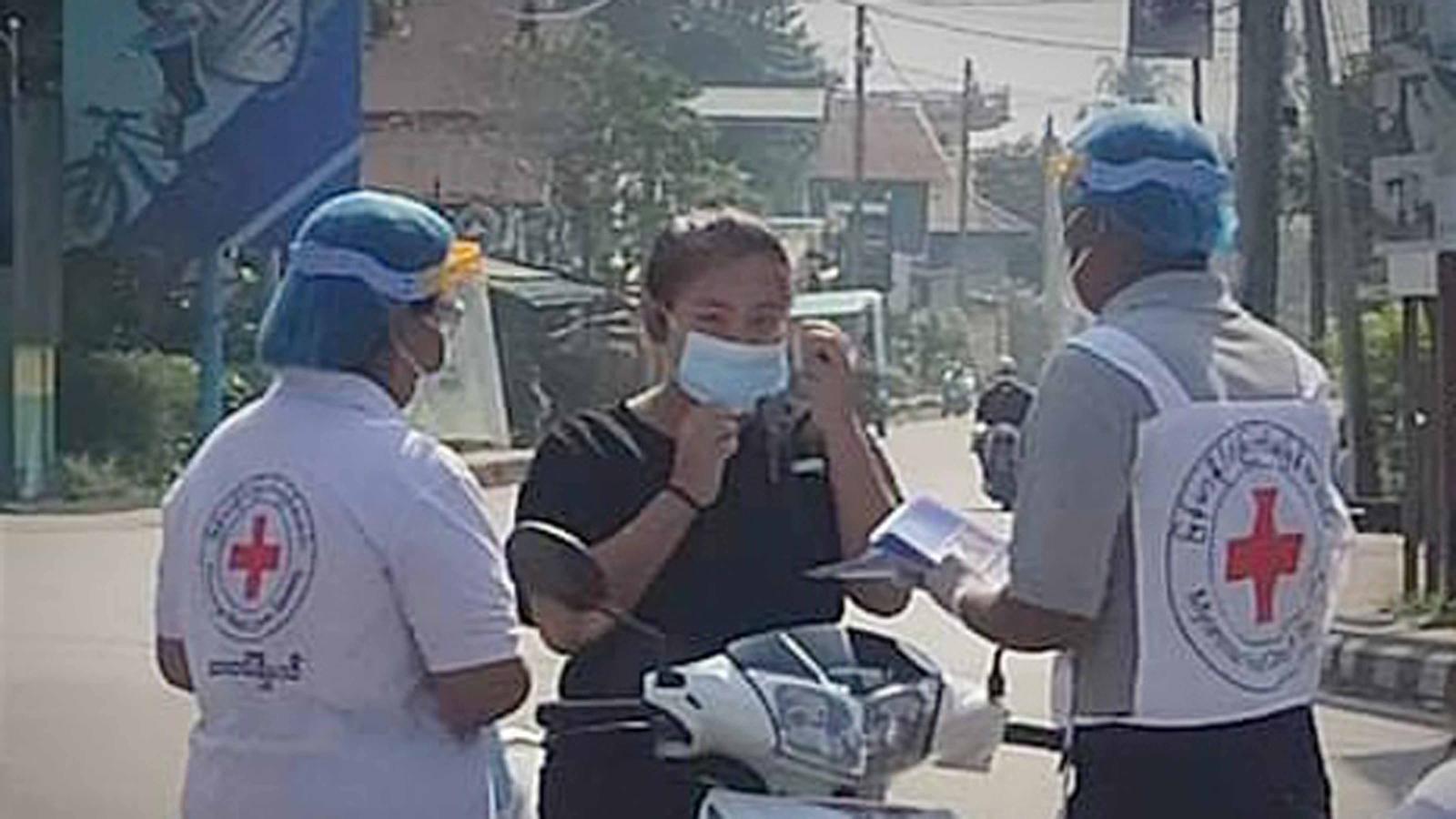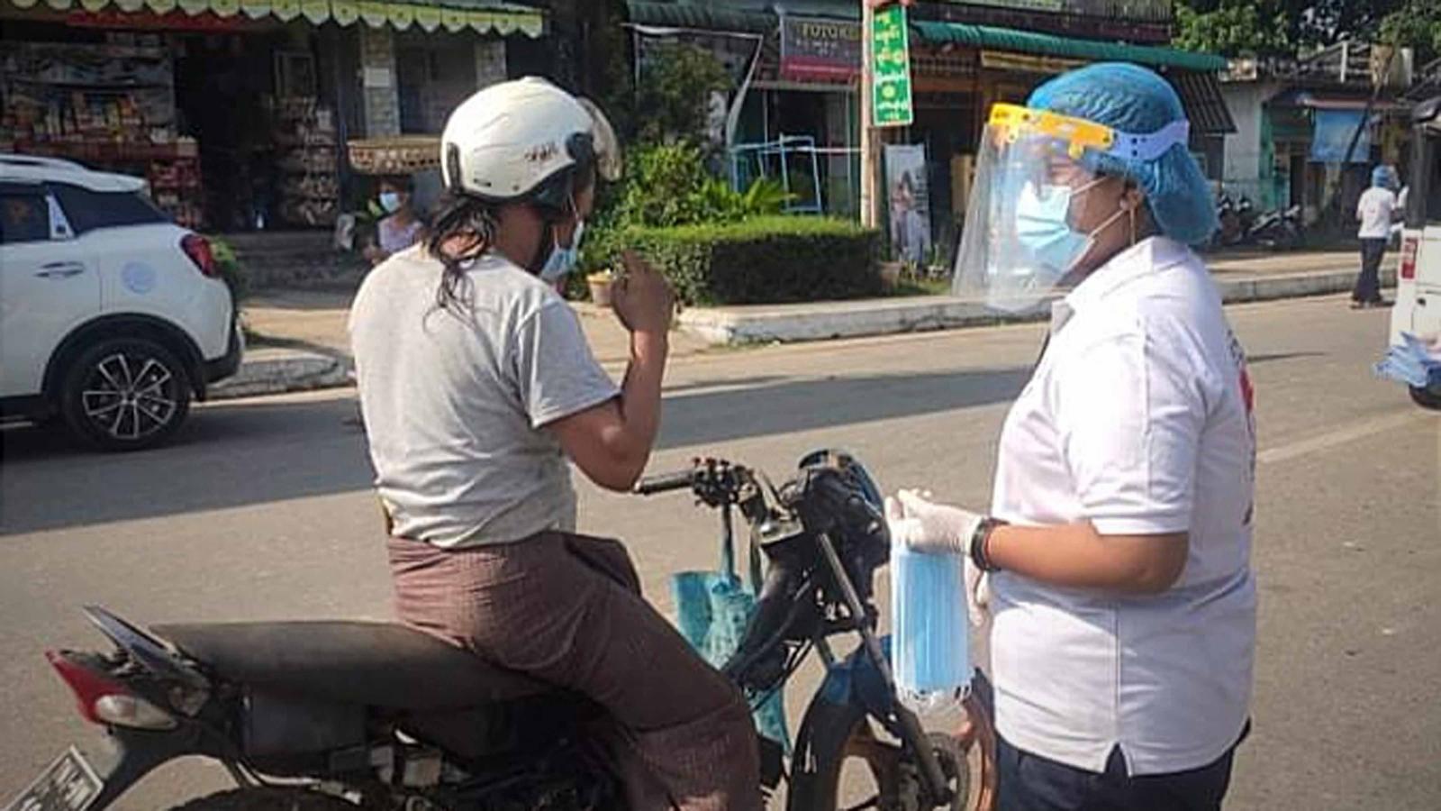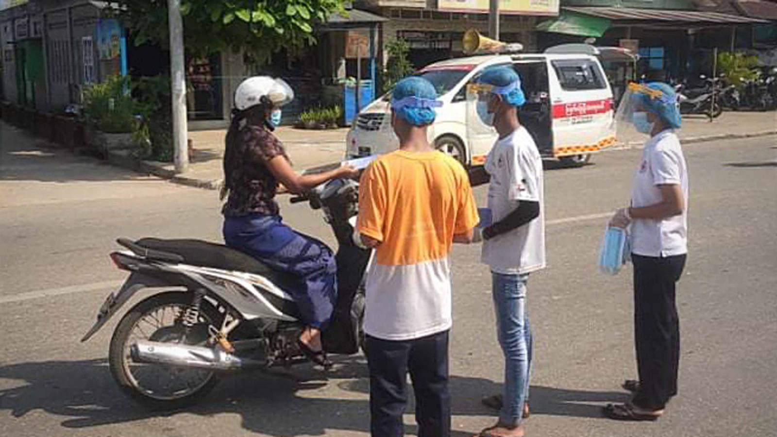 ထို့နောက် ကြက်ခြေနီသူနာပြုတပ်ဖွဲ့များက စျေး၊ လမ်းဆုံလမ်းခွ၊ ကားဂိတ်များနှင့် သွားလာလျက်ရှိသော အများပြည်သူများအား နှာခေါင်းစည်း Μask တပ်စေလိုသောအားဖြင့် အများပြည်သူများအား နှာခေါင်းစည်း Μask များ ဖြန့်ဝေပေးခြင်း၊ အများ ပြည်သူမြင်နိုင်သော နေရာများတွင် အသိပညာပေး ပိုစတာများ ကပ်ပေးခြင်းနှင့် ကိုဗစ်-၁၉ ရောဂါ ကူးစက်မှုမဖြစ်စေရန်ဆောင်ရန်/ရှောင်ရန် အချက်များပါရှိသည့် လက်ကမ်းစာစောင်များ အခမဲ့ဖြန့်ဝေပေးခဲ့ သည်။