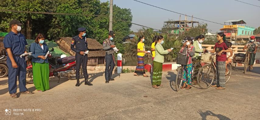 ထိုသို့ ဆောင်ရွက်ရာတွင် မြို့နယ်စီမံအုပ်ချုပ်ရေးအဖွဲ့ဝင်များ၊ မြို့နယ်အထွေထွေအုပ်ချုပ်ရေး ဦးစီးဌာနမှဝန်ထမ်းများ၊ ကျန်းမာရေးဌာနမှဝန်ထမ်းများ၊ မြို့နယ်ရဲတပ်ဖွဲ့ဝင်များ၊ မြို့နယ်စည်ပင်သာယာရေးအဖွဲ့မှ ဝန်ထမ်းများ၊ မြို့နယ် မီးသတ်တပ်ဖွဲ့ဝင်များ၊ ရပ်ကွက်အုပ်ချုပ်ရေးမှူများ ပူးပေါင်း၍ ခရီးသွားပြည်သူများ၊ ဈေးရောင်းဈေးဝယ် ပြည်သူများ အား ကိုဗစ်-၁၉ မျိုးကွဲသစ် အိုမီခရွန် (Omicron) ရောဂါ ကူးစက်ပြန့်ပွားမှု မရှိစေရေးအတွက် နေအိမ်ပြင်ပထွက်ခွာသွား လာရာတွင် နှာခေါင်းစည်း Maskကို မဖြစ်မနေ စနစ်တကျ တပ်ဆင်သွားလာရန်ကျန်းမာရေး ဝန်ကြီးဌာန၏ ကိုဗစ်-၁၉ရောဂါ ကြိုတင်ကာကွယ်ရေး လမ်းညွှန်ချက်များအား လိုက်နာဆောင်ရွက်ရန်တို့ကို အသိပညာပေး ပြောကြား ခဲ့ပြီး နှာခေါင်းစည်း (Mask) တပ်ဆင်ခြင်း မရှိသူများအား နှာခေါင်းစည်း( Mask)များ(အခမဲ့) ဖြန့်ဝေပေးခဲ့ကြောင်း သိရ သည်။