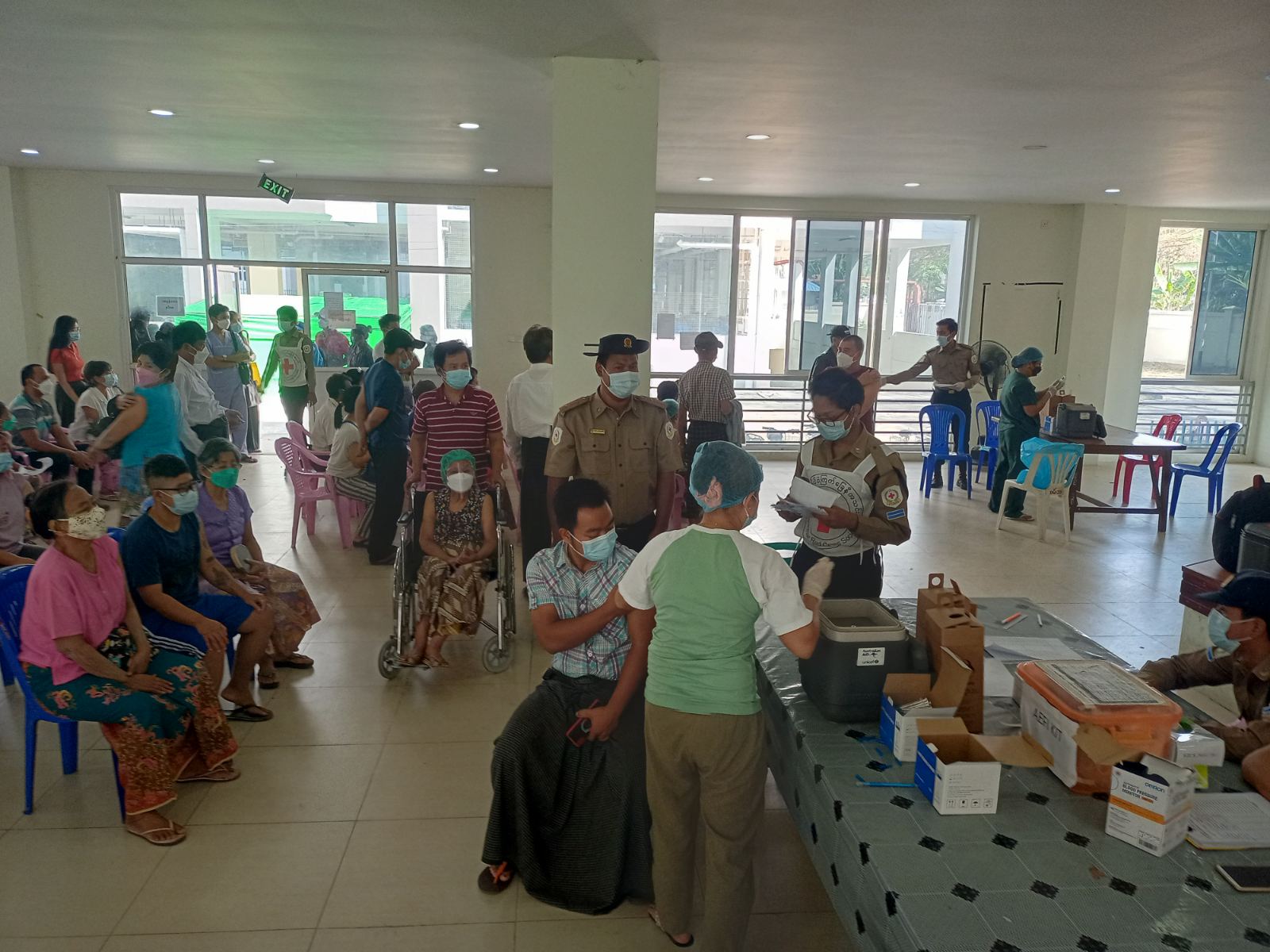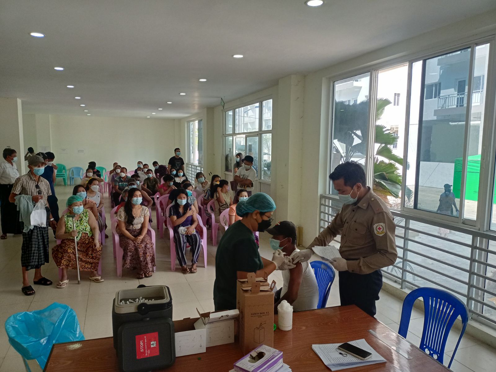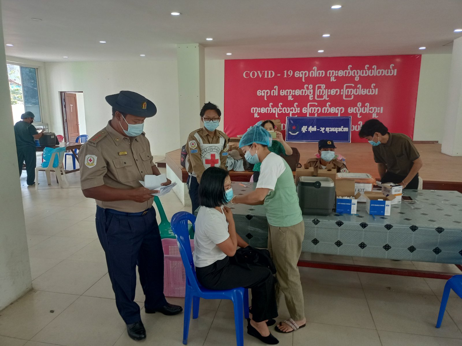 ရန်ကုန်တိုင်းဒေသကြီး၊ ရန်ကုန်အနောက်ပိုင်းခရိုင်၊ လှိုင်မြို့နယ်၌ကိုဗစ်-၁၉ရောဂါ ကာကွယ် ထိန်းချုပ်နိုင်ရန်အတွက် အသက်(၁၈)နှစ်နှင့်အထက် ပြည်သူများအားလှိုင်မြို့နယ်၊ အမှတ် ၁၂ ရပ်ကွက်၊ ယောဂီကျောင်းလမ်း၊ သိပ္ပံပစ္စည်း စက်ရုံ၀န်းရှိ ကိုဗစ်-၁၉ ကုသရေးစင်တာတွင် ကိုဗစ်-၁၉ ရောဂါကာကွယ်ဆေးဆက်လက်ထိုးနှံ ပေးလျက်ရှိရာ ယမန်နေ့ နံနက် ၉ နာရီအချိန် တွင် ရပ်ကွက် ( ၁၆) ရပ်ကွက်ရှိအသက်(၁၈)နှစ်နှင့်အထက် ပြည်သူများအားကိုဗစ်-၁၉ရောဂါ ကာကွယ်ဆေး(Covidshield)ထိုးနှံသူ ပထမအကြိမ် စုစုပေါင်း (၁၂၁)ဦးနှင့် ဒုတိယအကြိမ် စုစုပေါင်း(၁၉၉)ဦးအား ထိုးနှံပေးခဲ့ကြောင်း သိရသည်။ လှိုင်မြို့နယ် ကိုဗစ်-၁၉ ရောဂါထိန်းချုပ်ရေးနှင့်အရေးပေါ်တုံ့ပြန်ရေးလုပ်ငန်းကော်မတီ၏ ကြီးကြပ်မှုဖြင့်လှိုင်မြို့နယ်စီမံအုပ်ချုပ်ရေး ဥက္ကဋ္ဌ ဦးဟန်ဝင်းလတ်နှင့်ဝန်ထမ်းများ၊ သက်ဆိုင်ရာ ရပ်ကွက်အုပ်ချုပ်ရေးမှူးများ၊ စာရေးဝန်ထမ်းများ၊ ရဲတပ်ဖွဲ့ဝင်များ၊ မီးသတ် တပ်ဖွဲ့ဝင်များနှင့်ကြက်ခြေနီတပ်ဖွဲ့ဝင်များက ကာကွယ်ဆေးထိုးနှံရန် လာရောက်ကြသော အသက်(၁၈)နှစ် နှင့်အထက်ပြည်သူများ လူစုလူဝေးမဖြစ်ပေါ်စေရေး၊ သွားလာရေး အဆင်ပြေစေရန် ကျန်းမာရေးဝန်ကြီးဌာနမှ ထုတ်ပြန်ထားသော စည်းကမ်းချက်များနှင့်အညီဆောင်ရွက်လျက်ရှိကြောင်း သိရသည်။
