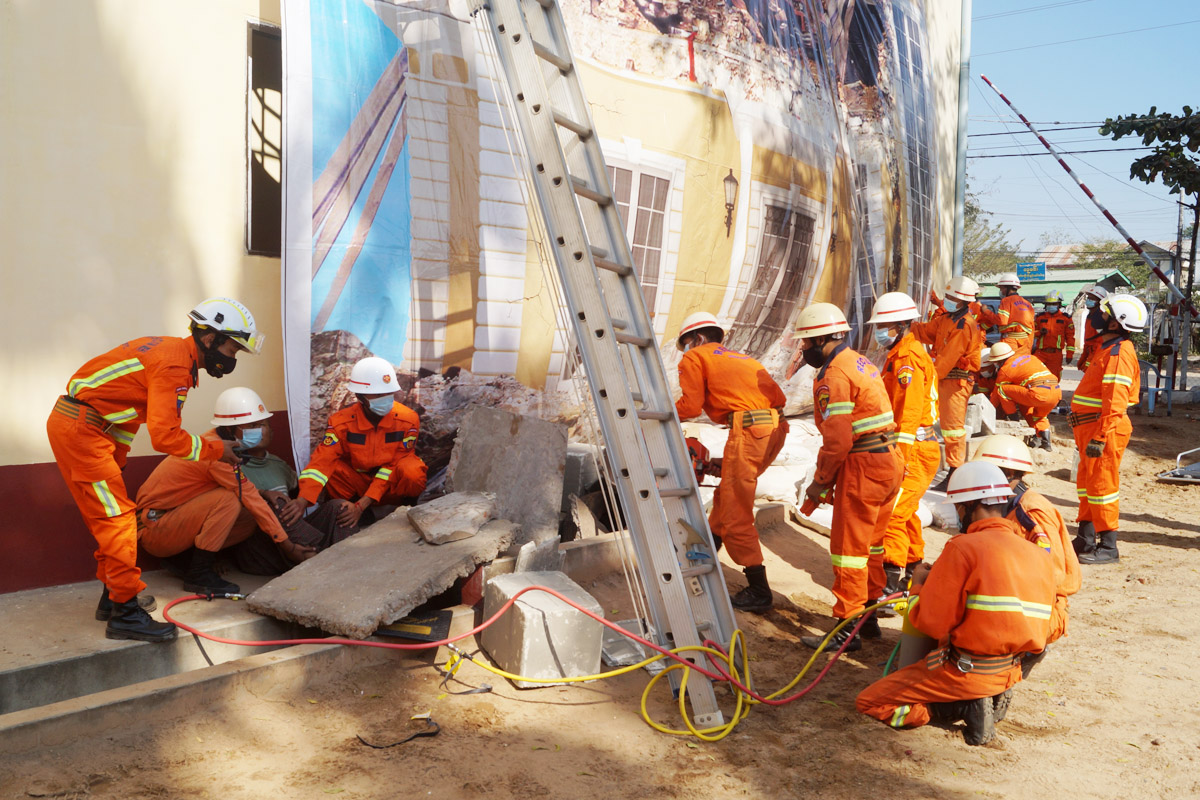 အဆိုပါ ဇာတ်တိုက်လေ့ကျင့်မှုဆောင်ရွက်ရာသို့ ညောင်ဦးခရိုင်မီးသတ်ဦးစီးဌာန၊ ခရိုင်မီးသတ်ဦးစီးမှူး ဦးထက်အောင် တက်ရောက်အားပေးခဲ့ပြီး၊ မြို့နယ်ဦးစီးမှူး ဦးကျော်နိုင်လင်း၊ စခန်းမှူး ဒုတိယဦးစီးမှူး ဦးမျိုးပိုင်သူထွေးနှင့် ဝန်ထမ်းများက ငလျင်ဘေးဒဏ် နှင့်ပတ်သက်၍ သဏ္ဍာန်တူရှာဖွေကယ်ဆယ်ရေး လုပ်ငန်းများကို သတ်မှတ် အဆင့်အတိုင်း အချိန်နှင့် တစ်ပြေးညီ စုဖွဲ့ဆောင်ရွက်ကြသည်။ “ ကျွန်တော်တို့ ဒီ ငလျင်ဘေးဒဏ်ရှာဖွေကယ်ဆယ်ရေးဆိုင်ရာ သဏ္ဍန်တူဇာတ်တိုက် လေ့ကျင့်မှုကို နိုင်ငံ တကာ သတ်မှတ်ချက်တွေဖြစ်တဲ့ စံ(၅)ချက်နဲ့အညီ ဇာတ်တိုက်လေ့ကျင့်ခြင်းဖြစ်ပါတယ်။ ငလျင်ဘေးဒဏ် တို့၊ မီးဘေးအန္တရာယ်တို့၊ ရေဘေးအန္တရာယ်တို့စတဲ့ သဘာဝဘေး အန္တရာယ်တွေနဲ့တွေ့ကြုံလာရင် တပ်ဖွဲ့ဝင်တွေရဲ့ စုဖွဲ့မှုနဲ့ အချိန်တိုတိုအတွင်း ထိခိုက်လူနာများကိုရှာဖွေကယ်တင်ခြင်း လုပ်ငန်းတွေအချိန်နဲ့ တပြေးညီဆောင်ရွက် နိုင်အောင် နှင့် ကူညီကယ်ဆယ်ရေးလုပ်ငန်းဆိုင်ရာ ပစ္စည်းများကိုလည်း ကျွမ်းကျွမ်းကျင်ကျင် ကိုင်တွယ်အသုံးပြုတတ်အောင် အခုလို သဏ္ဍန်တူ ဇာတ်တိုက်လေ့ကျင့် နေခြင်း ဖြစ်ပါ တယ်…” ဟု မြို့နယ်မီးသတ်ဦးစီးဌာနမှူး ဦးကျော်နိုင်လင်းက ပြောသည်။