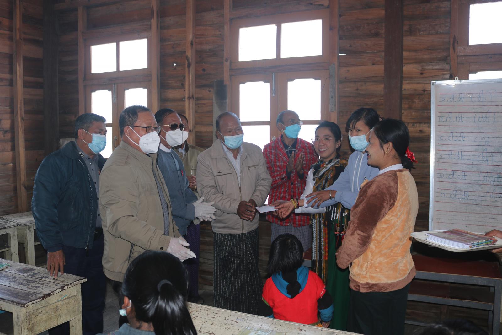 ပြည်နယ်ဝန်ကြီးချုပ်နှင့်အတူ ပြည်နယ်သယံဇာတရေးရာဝန်ကြီး ဦးကျော်ငြိမ်းနှင့် တိုင်းရင်းသားရေးရာ ဝန်ကြီးဦးစိန်ထွန်းလှတို့ လိုက်ပါလာကြပြီး ဟားခါးမြို့အမှတ်(၁) အခြေခံပညာအထက်တန်းကျောင်းနှင့် ရဲကုန်းအခြေခံပညာမူလတန်းကျောင်းရှိ ကျောင်းသား၊ ကျောင်းသူများ၏ ပညာသင်ကြားနေမှုကို ကြည့်ရှု ကာ ပြည်နယ်ဝန်ကြီးချုပ်က ကျောင်းသား၊ ကျောင်းသူများ အား မိမိတို့ကြီးလာရင် ဖြစ်ချင်သည့် ရည်မှန်း ချက်များကို မေးမြန်းပြီး မိမိရည်မှန်းချက်အတိုင်း ဖြစ်လာနိုင်ရန်အတွက် စာကြိုးစားရန်နှင့် ကျန်းမာရေး ကောင်းမွန်ရန်လိုကြောင်း၊ လက်ရှိအချိန်တွင် ကမ္ဘာ့နိုင်ငံအချို့နှင့် မိမိတို့နိုင်ငံရှိ အချို့ဒေသများတွင် ကိုဗစ်−၁၉ ရောဂါ မျိုးကွဲသစ် Omicron တွေ့ရှိနေသဖြင့် အသက် ၁၂ နှစ်နှင့်အထက် ကျောင်းသား၊ ကျောင်းသူများအားလုံး ကိုဗစ်−၁၉ ရောဂါကာကွယ်ဆေးထိုးနှံရန်လိုကြောင်း ပြောကြားပြီး ပြည်နယ် ဝန်ကြီးချုပ်နှင့် ပြည်နယ်ဝန်ကြီးများက ကျောင်းသား/သူများအား ကျောင်းသုံး ဗလာစာအုပ်များ ထောက်ပံ့ ပေးအပ်သည်။