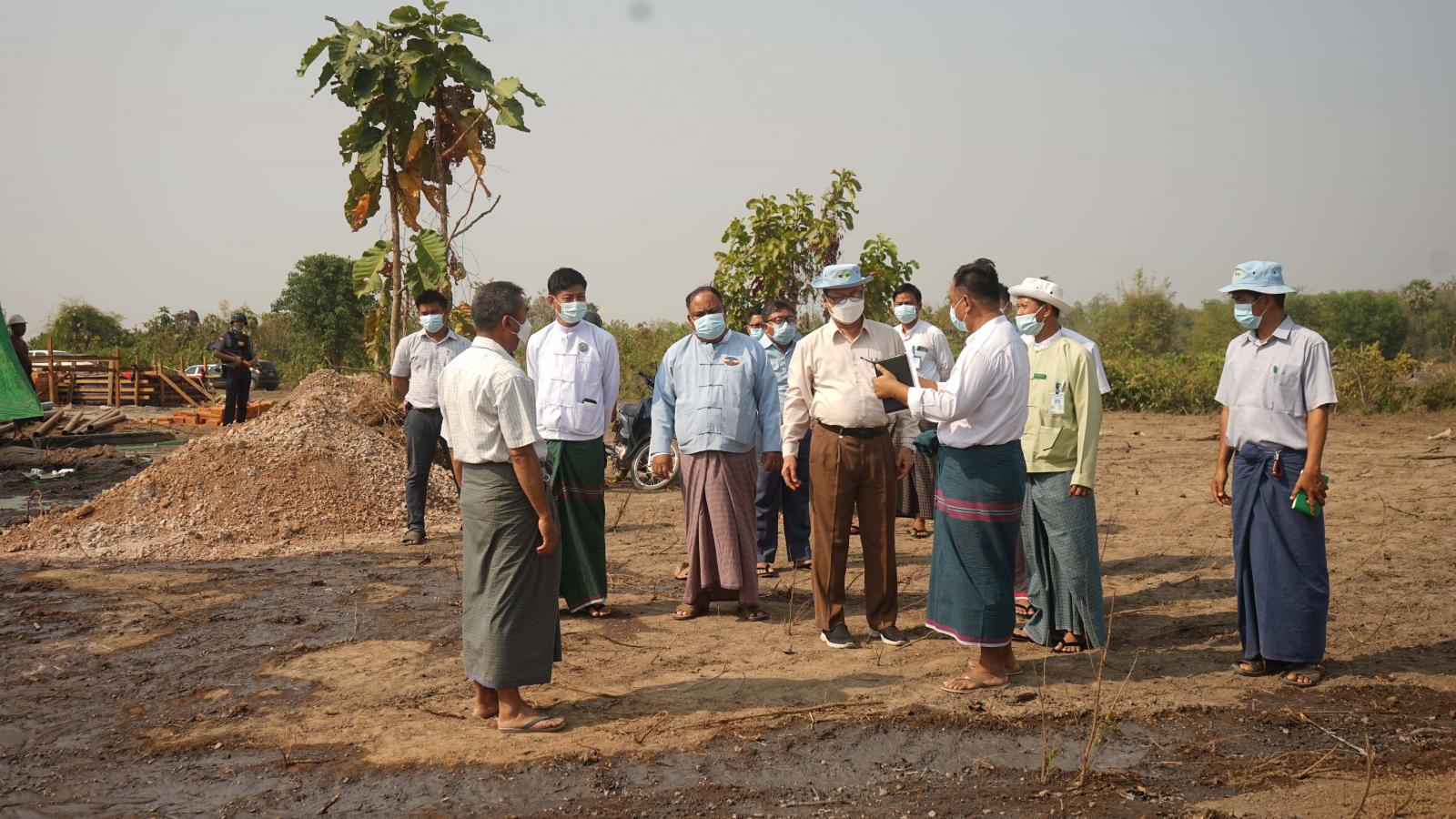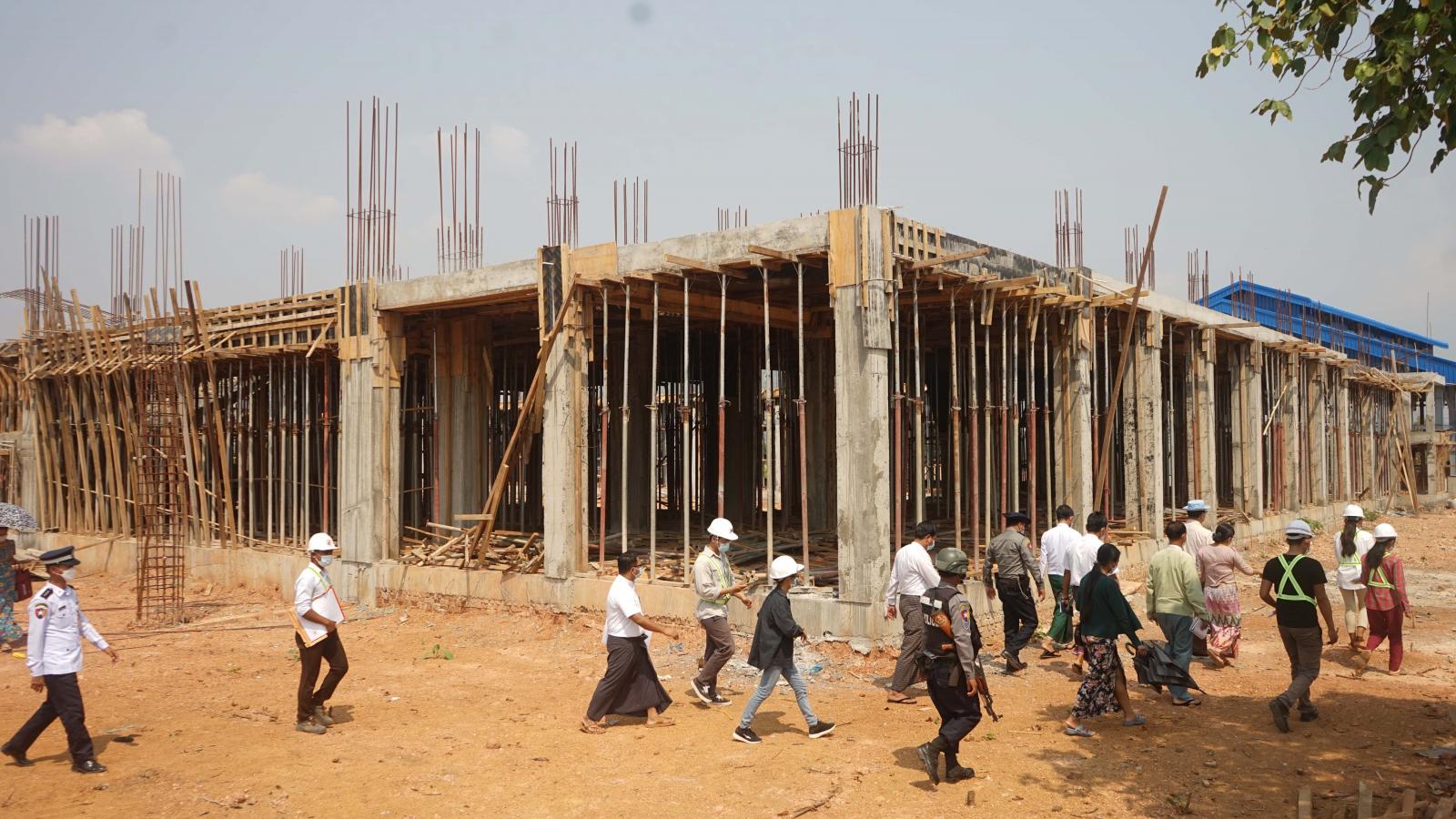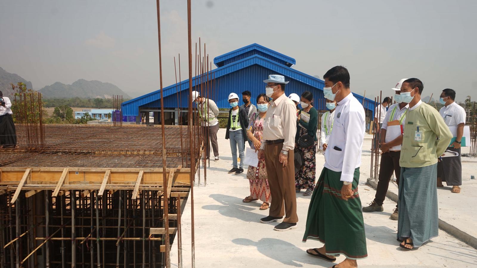 ထို့နောက် ပြည်နယ်ဝန်ကြီးချုပ်နှင့်အဖွဲ့သည် ရှားမူလာကုမ္ပဏီမှ တာဝန်ယူတည်ဆောက်လျက် ရှိသော (၁၂၅ပေ x ၈၂ပေ x ၁၈ပေ) Steel Structure တစ်ထပ် အလုပ်ရုံတည်ဆောက်ခြင်းလုပ်ငန်း၊ ထူးမြတ်ဂုဏ်ကုမ္ပဏီမှ တာဝန်ယူတည်ဆောက်လျက်ရှိသော (၂၁၁ ပေ x ၇၀ ပေ) RC နှစ်ထပ် နန်းငုဝါကျောင်း သူအိပ်ဆောင် တည်ဆောက်ခြင်းလုပ်ငန်း၊ နန်းထိုက်ဝင်းကုမ္ပဏီမှ တာဝန်ယူ တည်ဆောက်လျက်ရှိသော (၇၈ ပေ x ၉၄ ပေ) RCC လေးခန်းတွဲ လေးထပ် ဝန်ထမ်းအိမ်ရာ ဆောက်လုပ်ခြင်းလုပ်ငန်း၊ ထူးမြတ်လျှံကုမ္ပဏီမှ တာဝန်ယူတည်ဆောက်လျက်ရှိသော (၇၈ ပေx ၉၄ ပေ) RCC လေးခန်းတွဲ လေးထပ် ဝန်ထမ်း အိမ်ရာဆောက်လုပ်ခြင်းလုပ်ငန်း၊ စိုးမိုးသူကုမ္ပဏီမှ တာဝန်ယူတည်ဆောကလျက်ရှိသော (၂၁၁ ပေ x ၇၀ ပေ) RCC သုံးထပ်ကျောင်းသားအိပ်ဆောင် တည်ဆောက်ခြင်းလုပ်ငန်း၊ သမိန်ဗရမ်းဆောက်လုပ်ရေးကုမ္ပဏီမှ တာဝန်ယူတည်ဆောက်လျက်ရှိ သော (၇၈ ပေ x ၉၄ ပေ) RCC လေးခန်းတွဲ လေးထပ် ဝန်ထမ်းအိမ်ရာဆောက်လုပ်ခြင်းလုပ်ငန်းတို့ကို ကြည့်ရှုစစ်ဆေးပြီး သတ်မှတ်စံချိန်စံနှုန်းများနှင့်အညီ အချိန်မီပြီးစီးနိုင်ရေးကြိုးပမ်း ဆောင်ရွက်ကြရန်နှင့် လိုအပ်သည်များကို လမ်းညွှန်မှာကြားသည်။