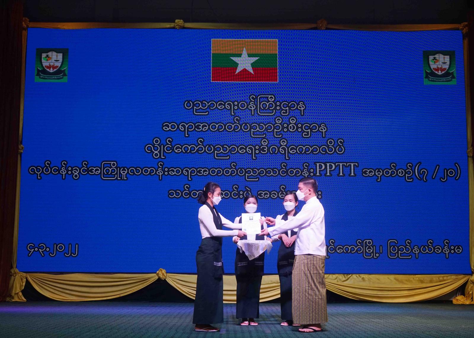 ကယားပြည်နယ်၊ လွိုင်ကော်မြို့၊ ဆရာအတတ်ပညာဦးစီးဌာန၊ ပညာရေးဒီဂရီကောလိပ်မှ ကျင်းပသည့် ၂၀၂၁-၂၀၂၂ ပညာသင်နှစ်၊ လုပ်ငန်းခွင်အကြို မူလတန်း ဆရာတတ်ပညာ သင်တန်း PPTT အမှတ်စဉ်(၇/၂၀) သင်တန်းဆင်းပွဲ အခမ်းအနားကို ယနေ့နံနက် ၉နာရီခွဲ အချိန်ကလွိုင်ကော်မြို့ ကယားပြည်နယ်ခန်းမ၌ ကျင်းပခဲ့သည်။