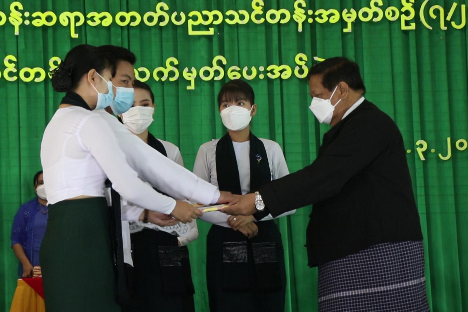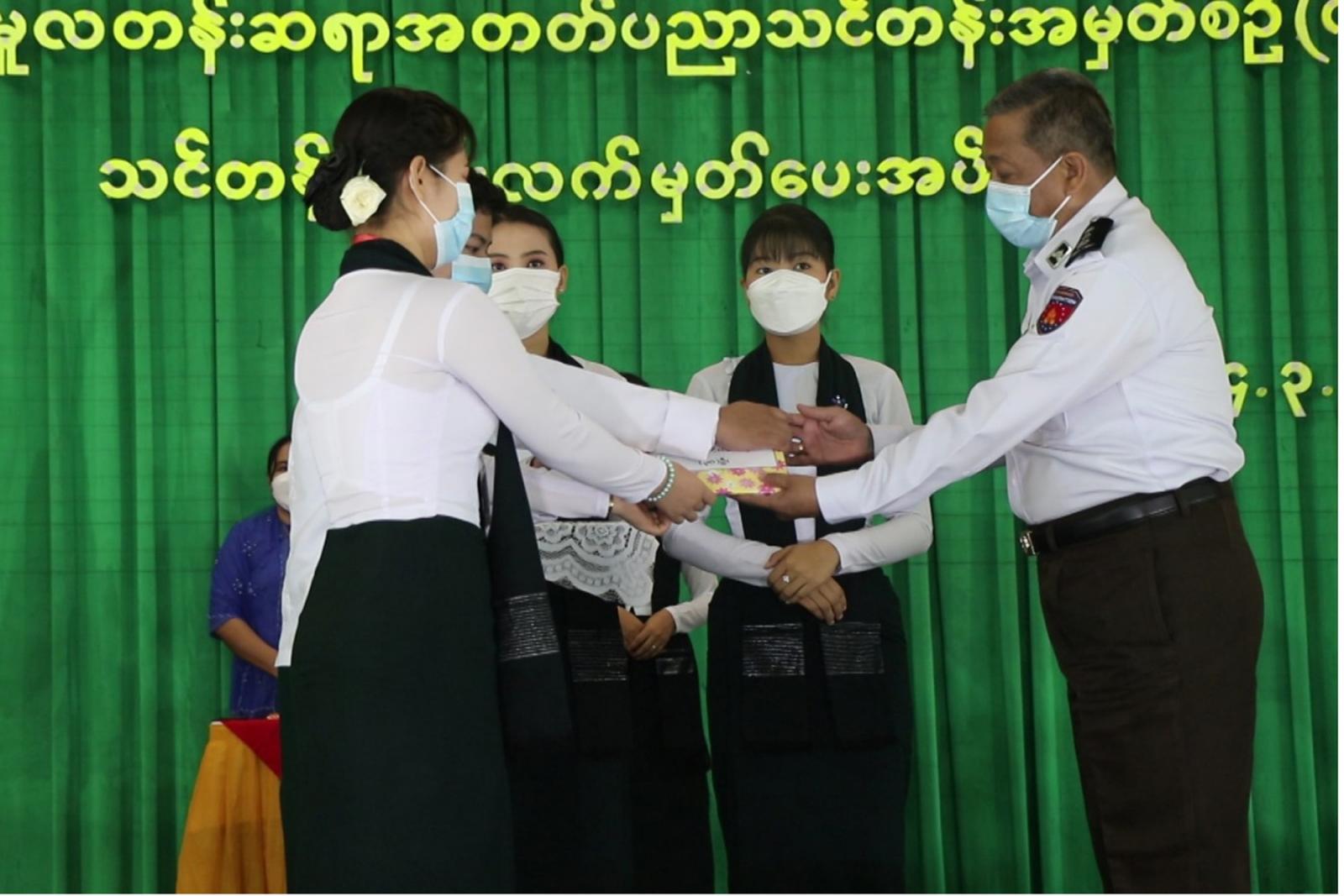 ထို့နောက် ပြည်နယ်ဝန်ကြီးချုပ်နှင့် ပြည်နယ်ဝန်ကြီးများသည် ၁၀ မြို့နယ်ကိုယ်စားပြု သင်တန်း သား၊ သင်တန်းသူများအား သင်တန်းဆင်းလက်မှတ်များ ပေးအပ်ပြီး ဂုဏ်ပြုတေးသီချင်း ဖြင့် သီဆို ဖျော်ဖြေမှုကို ကြည့်ရှုအားပေးသည်။