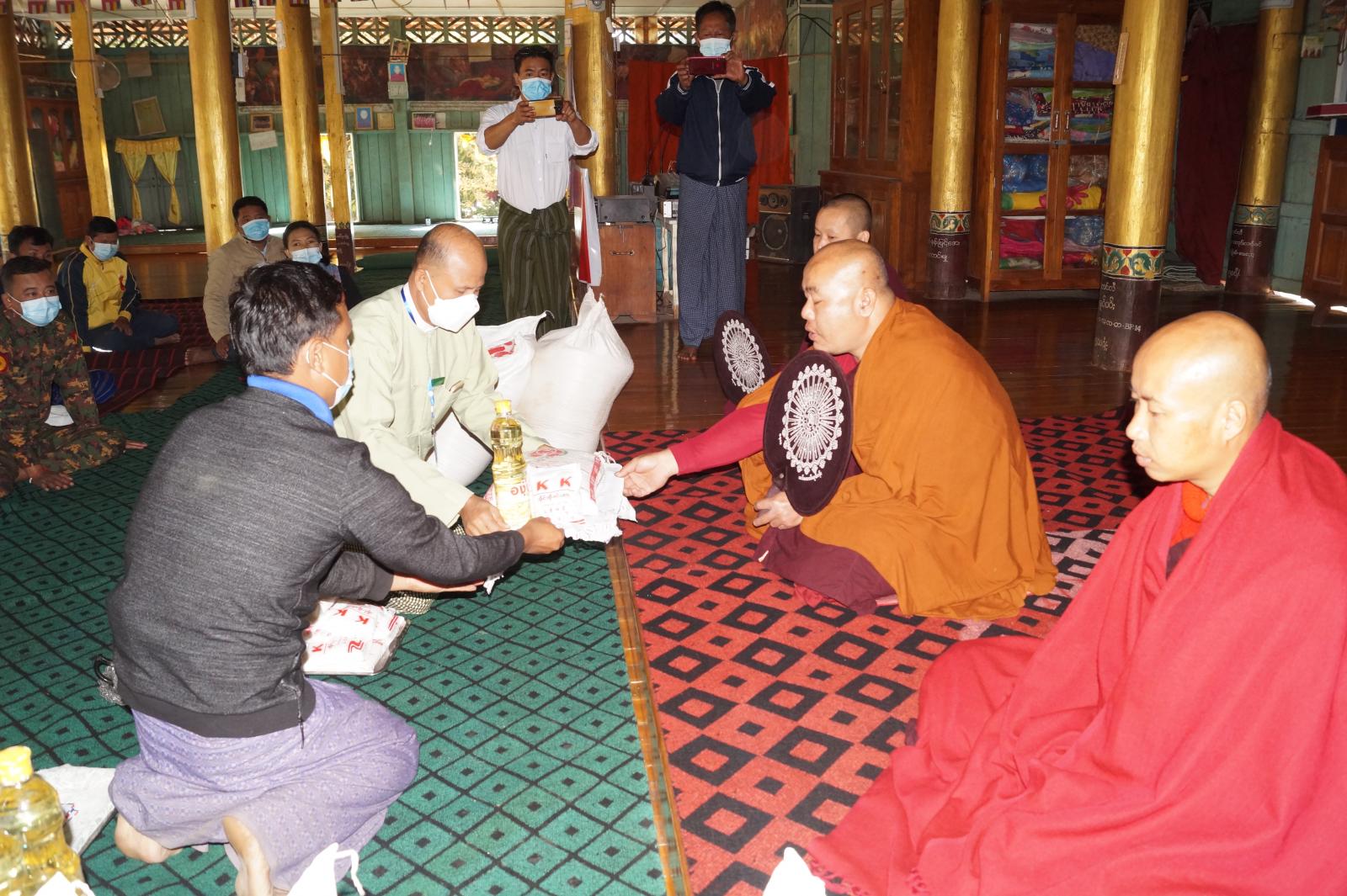 ဆက်လက်၍ မြို့နယ်စီမံအုပ်ချုပ်ရေးအဖွဲ့ဥက္ကဌ ဦးအောင်ကျော်သန်း၊ အဖွဲ့ဝင်ဗိုလ်မှူး အောင်ခိုင်စိုး နှင့် ဌာနဆိုင်ရာတာဝန်ရှိသူများက မယ်စဲ့မြို့နယ်အတွင်းရှိ ဘုန်းတော်ကြီးကျောင်း ၁၃ ကျောင်းမှ သံဃာတော်အရှင်သူမြတ်များ ကိုဗစ်ကာလ ဆွမ်းကိစ္စရပ်များ အဆင်ပြေစေရန်အတွက် ဆွမ်းဆန် စိမ်း၊ ဆီ၊ ဆား၊ ဆေးနှင့် လှူဖွယ်ဝတ္ထုပစ္စည်းများကို ဆရာတော် သံဃာတော်များထံ ဆက်ကပ်လှူဒါန်းကြသည်။