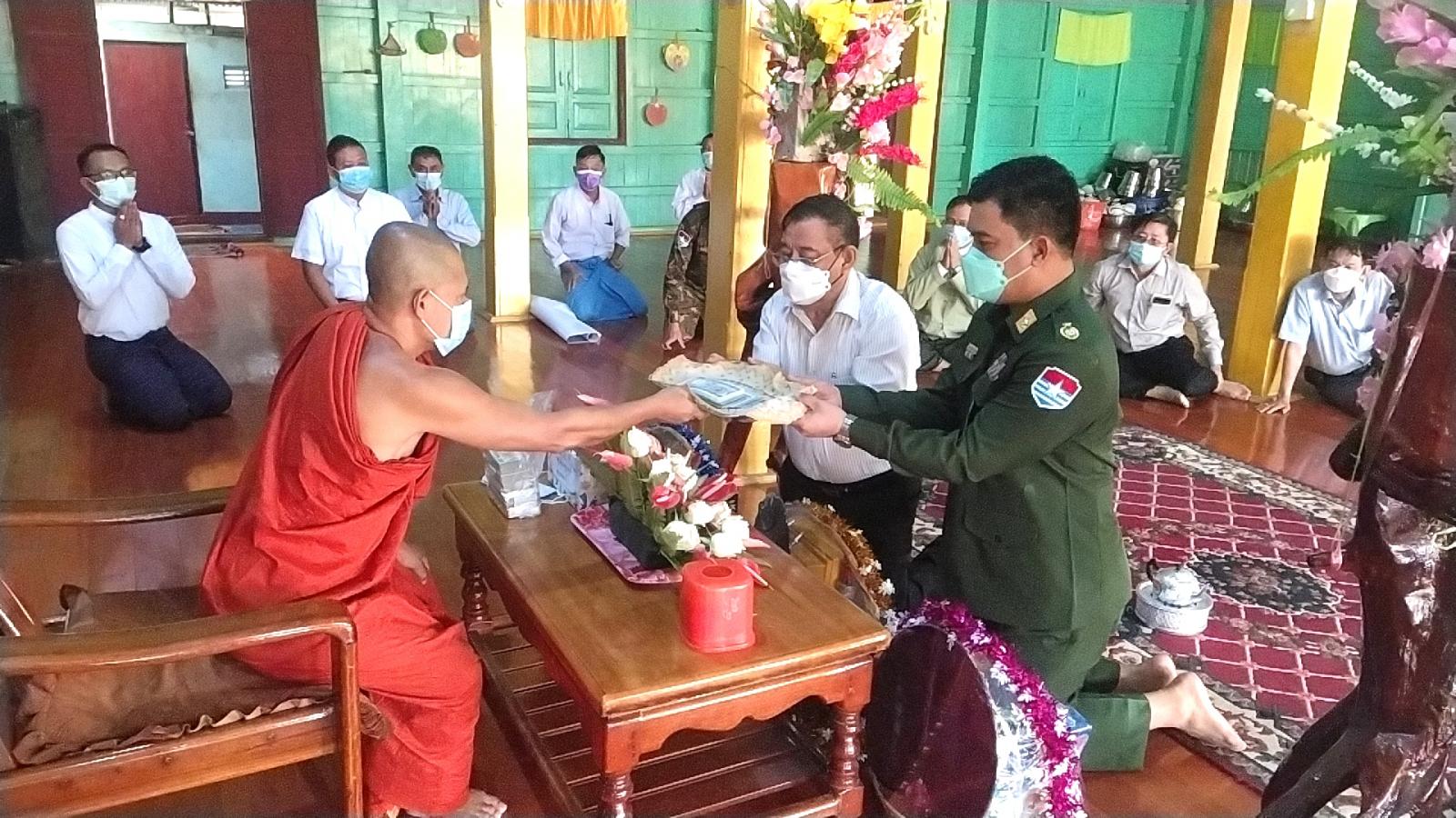 ဆက်လက်၍ ဝန်ကြီးချုပ်နှင့်အဖွဲ့သည် ချောင်းငယ်ကျောင်းတိုက် ဦးစီးနာယကဆရာတော် ဘဒ္ဒန္တသံဝရ အားဖူးမြော်ကြည်ညိုကြ၍ ချောင်းငယ်ကျောင်းတိုက် အတွင်း တည်ဆောက်လျက်ရှိသည့် သုခိတာဘောဇန (၂)ထပ်ဆွမ်းစားဆောင်ဆောက်လုပ်ရန်အတွက် အလှူငွေနှင့်လှူဘွယ်ဝတ္ထုပစ္စည်းများ ဆက်ကပ် လှူဒါန်းပေးကြကြောင်း သိရှိရသည်။