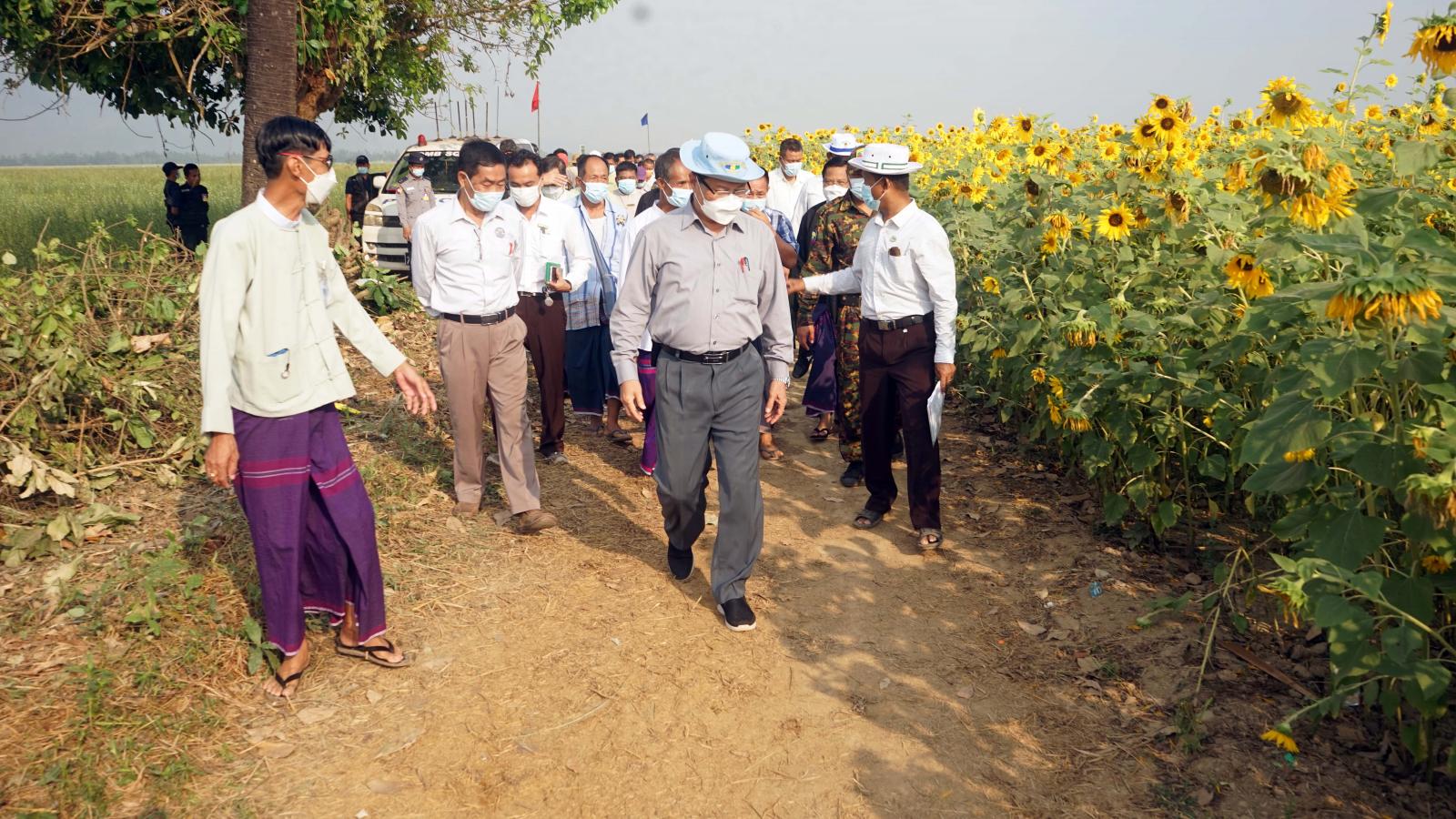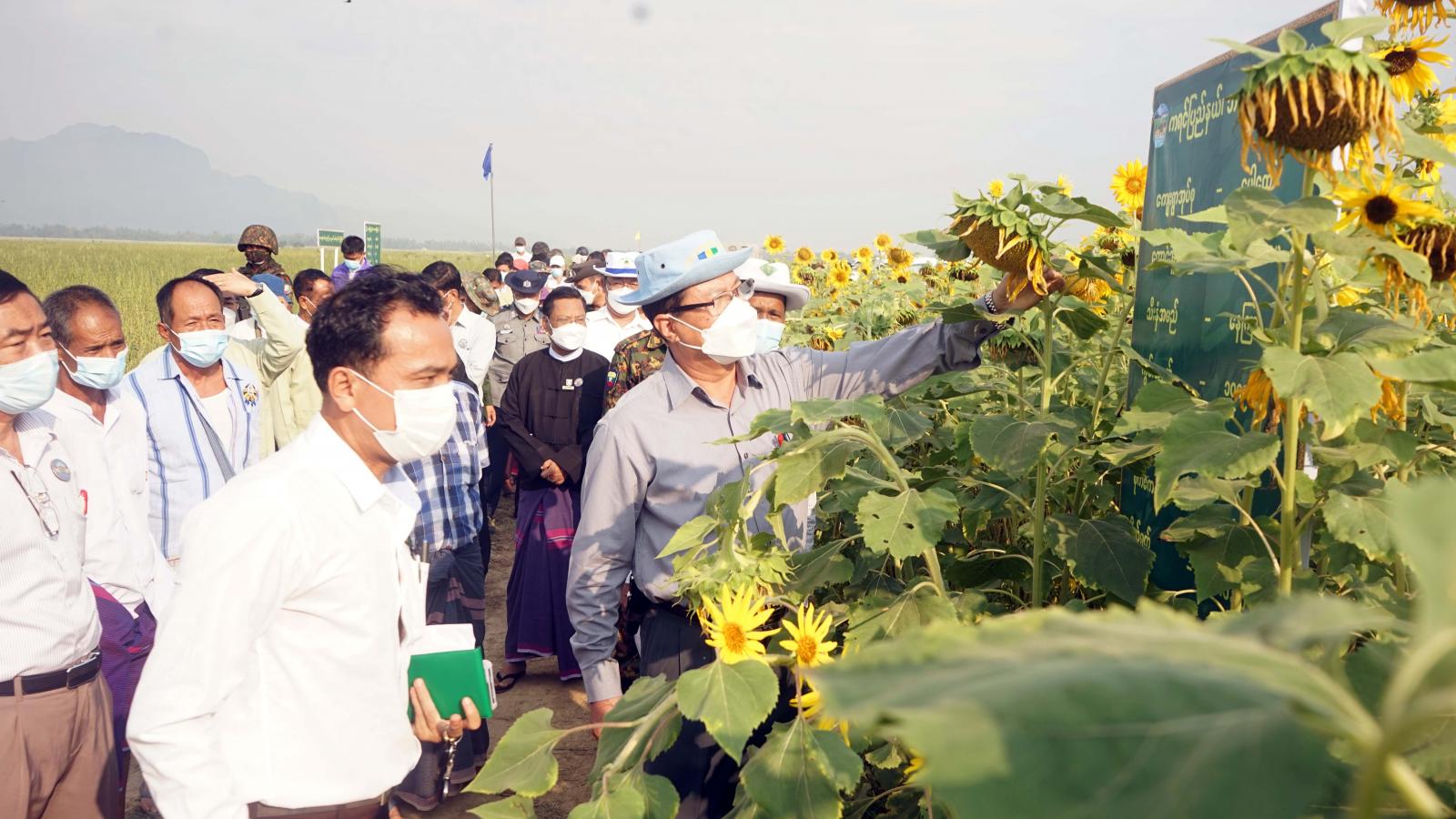 ထို့နောက် ပြည်နယ်ဝန်ကြီးချုပ်၊ ပြည်နယ်တရားလွှတ်တော်တရားသူကြီးချုပ် ဦးသိန်းကိုကို၊ ပြည်နယ်အစိုးရ အဖွဲ့ဝင်များနှင့် ဌာနဆိုင်ရာတာဝန်ရှိသူများသည် တစ်စပ်တစ်ဆက်တည်း စိုက်ဧက (၇၀၀)ကျော်ရှိ ပေါ့ထော်တောင် ကွင်းတွင် စိုက်ပျိုးထားရှိသော နေကြာ၊ နှမ်း၊ မြေပဲ၊ ပဲပုပ်၊ ပြောင်း စိုက်ခင်းများအား ကြည့်ရှု့အားပေးသည်။