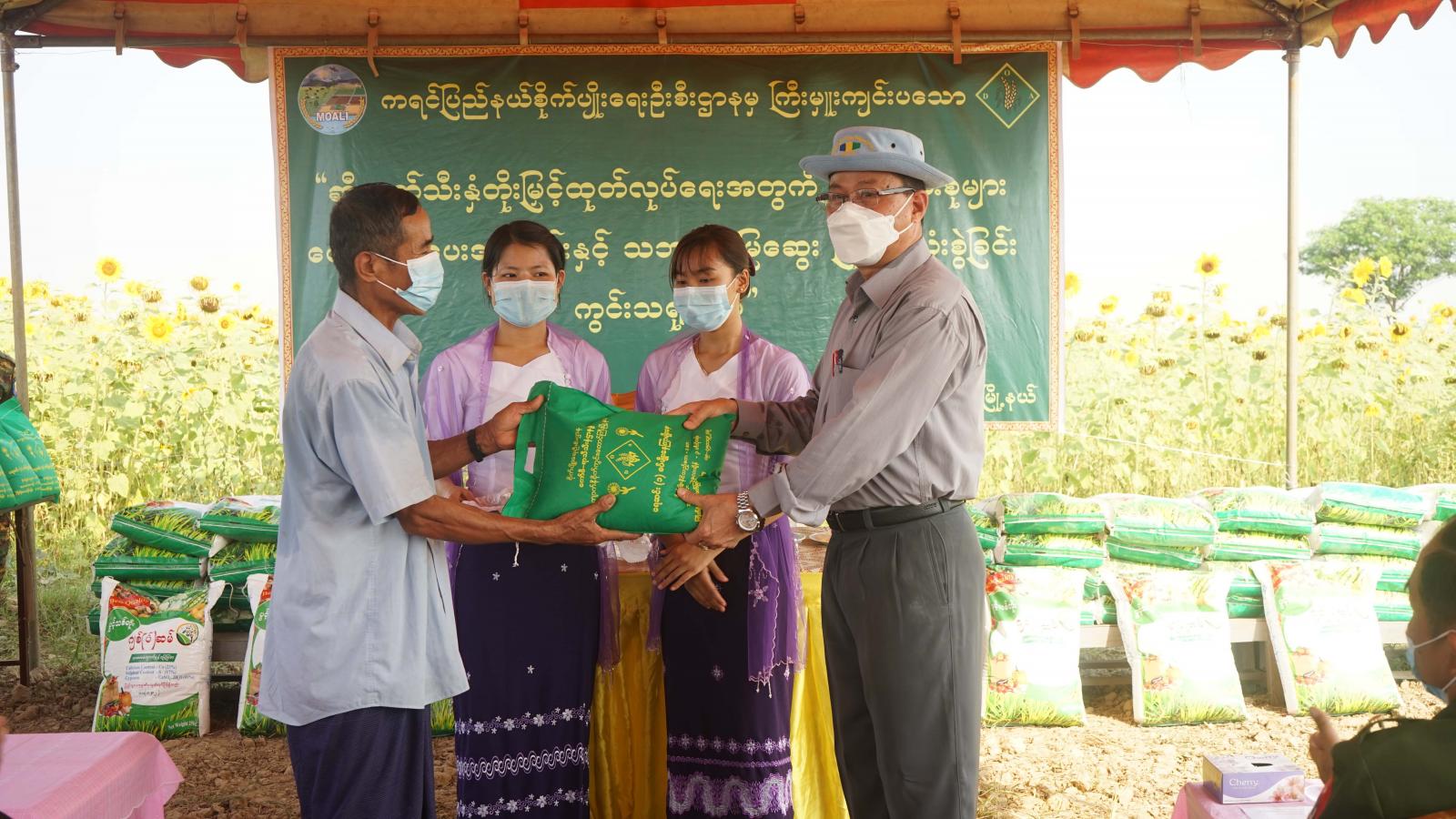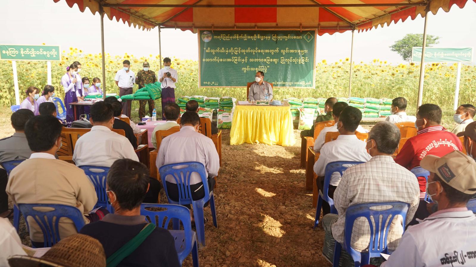 ထို့နောက် ပြည်နယ်ဝန်ကြီးချုပ်၊ ပြည်နယ်တရားလွှတ်တော်တရားသူကြီးချုပ်နှင့် ပြည်နယ်အစိုးရ အဖွဲ့ဝင်များသည် တက်ရောက်လာသော တောင်သူများအား ကျောက်မှုန့်မြေဩဇာနှင့် ရေဆင်း(၁) စပ်မျိုးနေကြာမျိုးစေ့များ ထောက်ပံ့ပေးအပ်ရာ တောင်သူများကလက်ခံရယူခဲ့ကြပြီး တောင်သူ တစ်ဦးက ကျေးဇူးတင် စကားပြောကြားသည်။