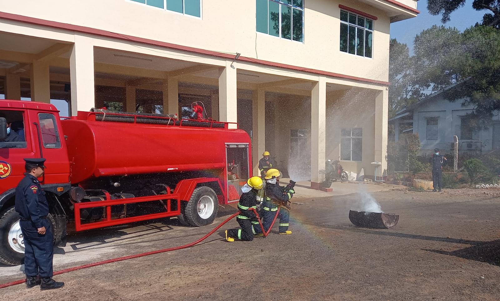 အဆိုပါ သရုပ်ပြဇာတ်တိုက် လေ့ကျင့်ခြင်းကို မီးသတ်ဦးစီးဌာန၏ ညွန်ကြားချက်များနှင့်အညီ ခရိုင် မီးသတ်ဦးစီးဌာန၊ ခရိုင် ဦးစီးမှူး ဦးကျော်ဆန်း ဦးဆောင်သော တပ်ဖွဲ့ဝင်များမှ မီးငြှိမ်းသတ်ယာဉ်(၁)စီး၊ ရှာဖွေကယ်ဆယ်ရေးယာဉ် (၁) စီးဖြင့် မီးလောင် မှုအား လက်တွေ့မီးငြှိမ်းသတ်မှုနည်းစနစ်များ၊ ကယ်ဆယ်ရေးသုံးပစ္စည်း ကိရိယာများအသုံးပြုကာ ပျက်စီးပြိုကျနေသည့် အပျက် အစီးများအကြား ပိတ်မိနေသူများအား ရှာဖွေကယ်ဆယ်ခြင်းနှင့် ကယ်ဆယ်ရရှိသူများတွင် ဒဏ်ရာရရှိသူများအား ရှေးဦးပြုစုခြင်း စသည့် ရှာဖွေကယ်ဆယ်ရေး လုပ်ငန်းများကို ဇာတ်တိုက်လေ့ကျင့်ခဲ့ကြခြင်းဖြစ်ပြီး နိုင်ငံပိုင် အဆောက်အဦးများနှင့် ဒေသခံ ပြည်သူများ၏ အသက်အိုးအိမ် ပစ္စည်းများ မီးလောင်မှုကြောင့် ထိခိုက်ပျက်စီးမှုမှ ကာကွယ်နိုင်ရန် အရေးပေါ် အခြေအနေ တစ်စုံ တစ်ရာ ဖြစ်ပေါ်လာပါက မီးသတ်တပ်ဖွဲ့၏ ဆောင်ပုဒ်နှင့်အညီ စွမ်းဆောင်ရည်ပြည့်၀သောလူ၊ ယာဉ်/စက်၊ စက်သုံးဆီနှင့် ရေ အသင့်အနေအထားတို့ဖြင့် ထိခိုက်ပျက်စီးဆုံးရှုံးမှုနည်းအောင် အမြန်းဆုံး တုံ့ပြန်ကာကွယ်ဆောင်ရွက်နိုင်ရန် ရည်ရွယ်၍ လေ့ကျင့် ဆောင်ရွက်ခြင်းဖြစ်ပါကြောင်း တာဝန်ရှိသူတစ်ဦး၏ ပြောကြားချက်အရ သိရှိရသည်။