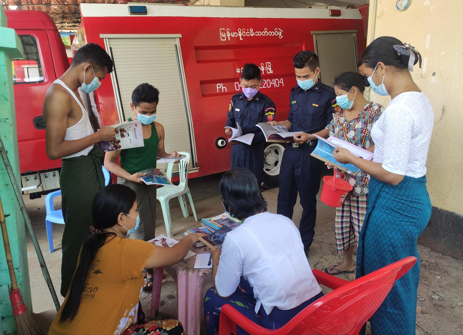 ထိုသို့ဆောင်ရွက်ရာတွင် မြို့နယ်ပြန်ကြားရေးနှင့်ပြည်သူ့ဆက်ဆံရေးဦးစီးဌာန ဝန်ထမ်းများက စာပေဖတ်ရှုမှု ပိုမိုမြှင့်မားလာစေရန်၊ စာပေဖတ်ရှုသည့် အလေ့အထကောင်းများ ရရှိစေရန်နှင့် အလုပ်တာဝန်များကြောင့် စာကြည့်တိုက်သို့ စာအုပ်စာပေများ လာရောက် မငှားရမ်းနိုင်သည့် ဝန်ထမ်းများအတွက် ရည်ရွယ်၍ သုတ၊ ရသစာအုပ်များ စုစုပေါင်း(၄၅)အုပ်ကို မြို့နယ်မီးသတ် တပ်ဖွဲ့ဝင်များနှင့် မိသားစုဝင်များအား Mobile Library စနစ်ဖြင့် စာအုပ်များ ငှားရမ်း ဝန်ဆောင်မှုပေးခဲ့ကြောင်း သိရသည်။