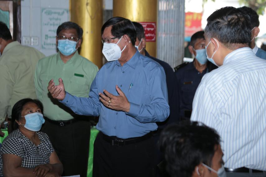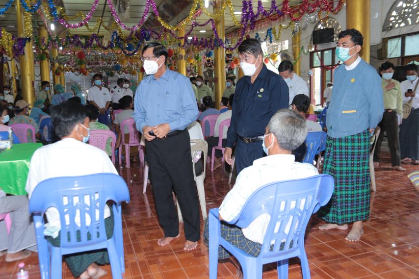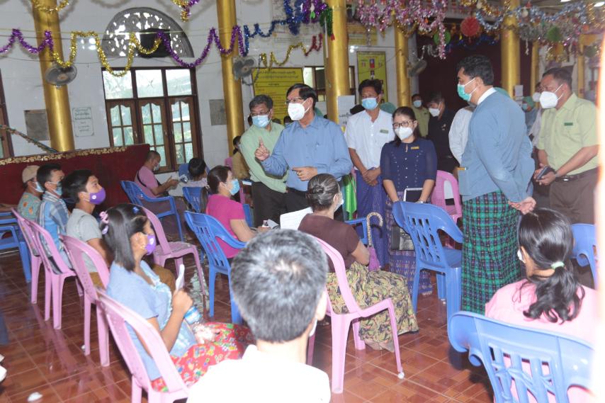ဆက်လက်၍ ဝန်ကြီးချုပ်နှင်အဖွဲ့သည် အရှေ့ပိုင်းခရိုင်လမ်းဦးစီးဌာနမှ ဆောင်ရွက်လျက်ရှိသော အမှတ် ၇ လမ်းမကြီး ကွန်ကရစ် လမ်းခင်းခြင်းလုပ်ငန်းအား ကြည့်ရှုစစ်ဆေးခြင်း၊ အမှတ်(၈)ရပ်ကွက်ရှိသာ သနာရက္ခိတဓမ္မာရုံတွင် အသက်၁၈နှစ်ပြည့်ပြီးသူများ အားကိုဗစ်-၁၉ကာကွယ်ဆေးထိုးနှံပေးမှုအား ကြည့်ရှုအားပေး၍ ပြည်သူများအား ရင်းနှီးနွေးထွေးစွာ တွေ့ဆုံ၍ ကာကွယ်ဆေး ထိုးနှံခြင်းဖြင့်ရရှိလာမည့် အကျိုးကျေးဇူးများအကြောင်း ရှင်းလင်းပြောကြားပြီးနောက် တိုင်းဒေသကြီးလူမှုရေးရာဝန်ကြီးမှ ပန်းခင်းစီမံချက်ဖြင့် နိုင်ငံသားစိစစ်ကတ်ပြားများ ကွင်းဆင်းဆောင်ရွက်ပေးနေမှုအား ရှင်းလင်းဆွေးနွေးခဲ့ကြောင်း သိရသည်။