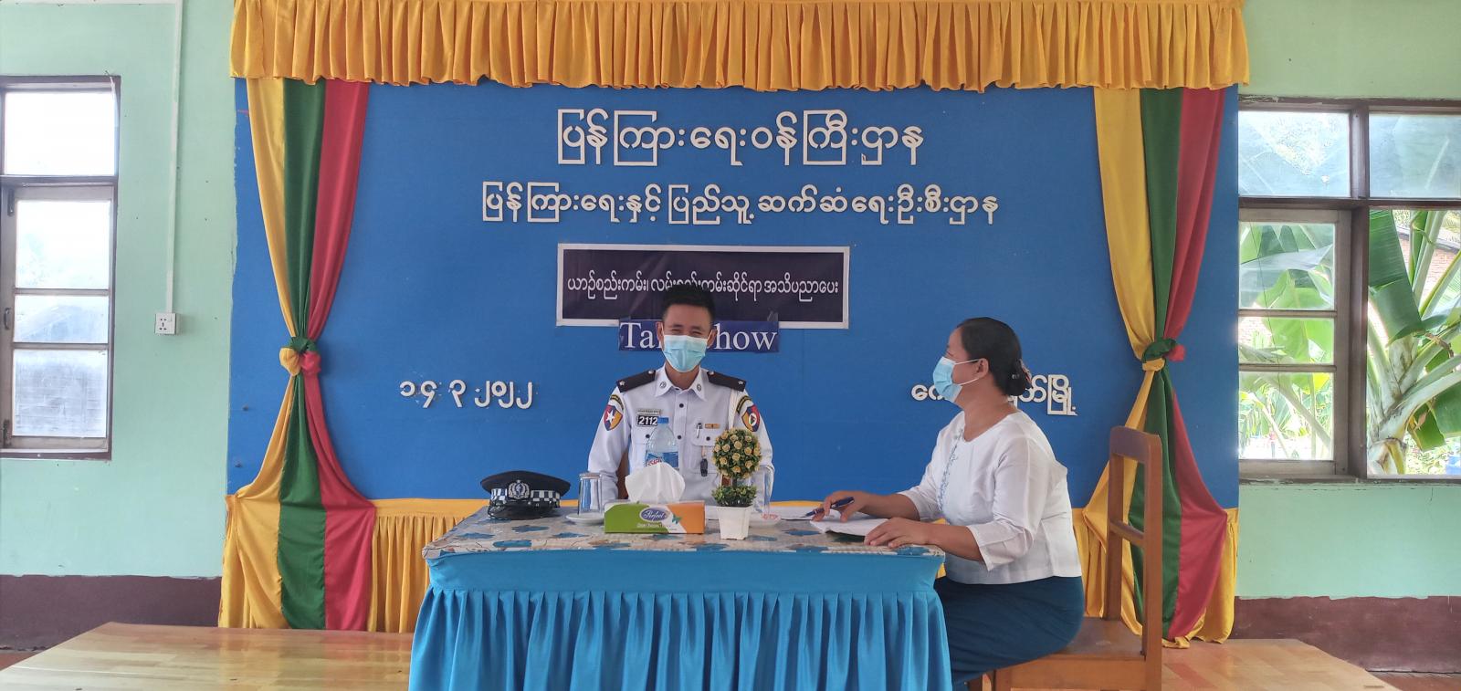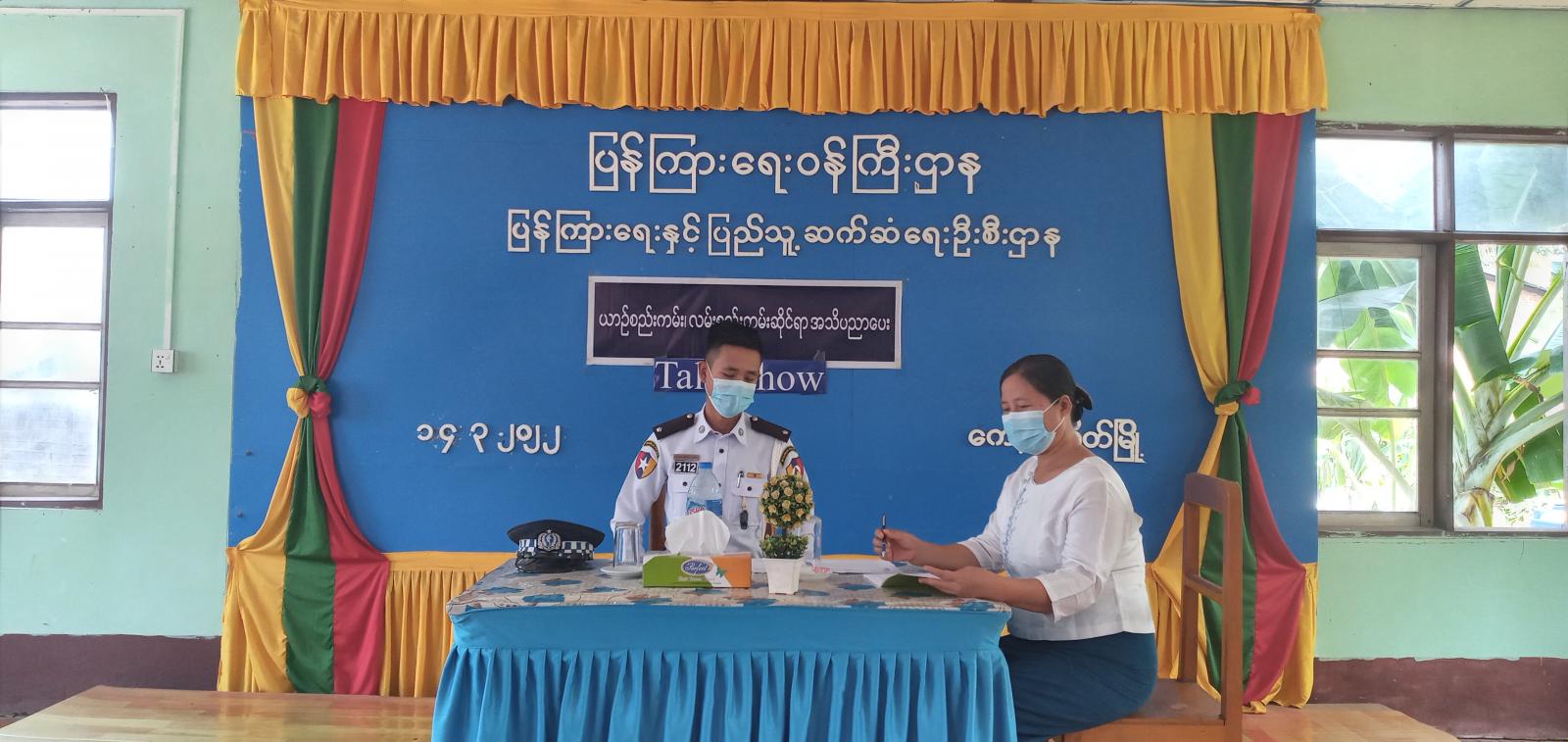 ရှေးဦးစွာ ကော့ကရိတ်ခရိုင် ပြန်ကြားရေးနှင့်ပြည်သူ့ဆက်ဆံရေးဦးစီးဌာန လက်ထောက် ညွှန်ကြားရေးမှူး ဒေါ်ခင်လေးနွယ်က အသိပညာပေးTalk Show ပြုလုပ်ရတဲ့ ရည်ရွယ် ချက်ကိုရှင်းလင်းပြောကြားပြီး သိရှိလိုသည်များကို မေးမြန်းဆွေးနွေးပြောကြားရာ အမှတ် (၇၁) ယာဉ်ထိန်းရဲတပ်ဖွဲ့စုကော့ကရိတ်မှ တာဝန်မှူး(ယာဉ်အမှုစစ်) လ ၂၅၅၁၅၇ ဒုရဲအုပ်ချမ်းမြေ့သူမှ ယာဉ်စည်းကမ်းလမ်းစည်းကမ်းဆိုင်ရာနှင့် ပတ်သက်၍ပြည်သူများ သတိပြုလိုက်နာရန် အချက်များ၊ မော်တော်ဆိုင်ကယ်စီးနင်းသူများ အန္တရာယ်ကင်းရှင်းစေရေးအတွက် သတ်မှတ်ထား သည့် စည်းကမ်းချက်များ၊ လမ်းညွှန်ဆိုင်းဘုတ်အမှတ်အသားများ၊ သတိပေးတားမြစ် အမှတ်အသား များသတိပြု ဆင်ခြင်ရမည့်အချက်များ တို့ကို လိုက်နာဆောင်ရွက်စေရေး ယာဉ်/လမ်းစည်းကမ်း လိုက်နာမှုပျက်ကွက်ပါက ဥပဒေအရအရေးယူခံရမည့် ဆိုးကျိုးခံစားရမှုများစသည့် အကြောင်းအရာများအား ဆွေးနွေးခဲ့ကြောင်း သိရသည်။