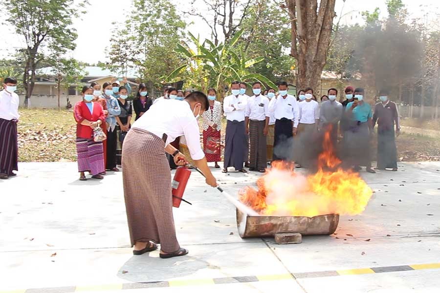 ထို့နောက် ဝန်ထမ်းများ၊ ဝန်ထမ်းမိသားစုများကို မီးလောင်မှု ဖြစ်ပွားလာပါက ကိုယ်တိုင် ဆောင်ရွက်နိုင်ရေးအတွက် သရုပ်ပြ လေ့ကျင့် ဆောင်ရွက်ပေးရာ တက်ရောက်လာကြသည့် ဝန်ထမ်းများက ပူးပေါင်းသရုပ်ပြလေ့ကျင့်ခဲ့ပြီး ဒုတိယ ညွှန်ကြားရေးမှူး ဦးခင်မောင်သန်းက ရုံးနှင့် ဝန်ထမ်းလိုင်းခန်းတို့တွင် မီးဘေးအန္တရာယ် ကင်းဝေးစေရေးအတွက် လိုက်လံစစ်ဆေး အကြံပြု ခဲ့ကြောင်း သိရသည်။