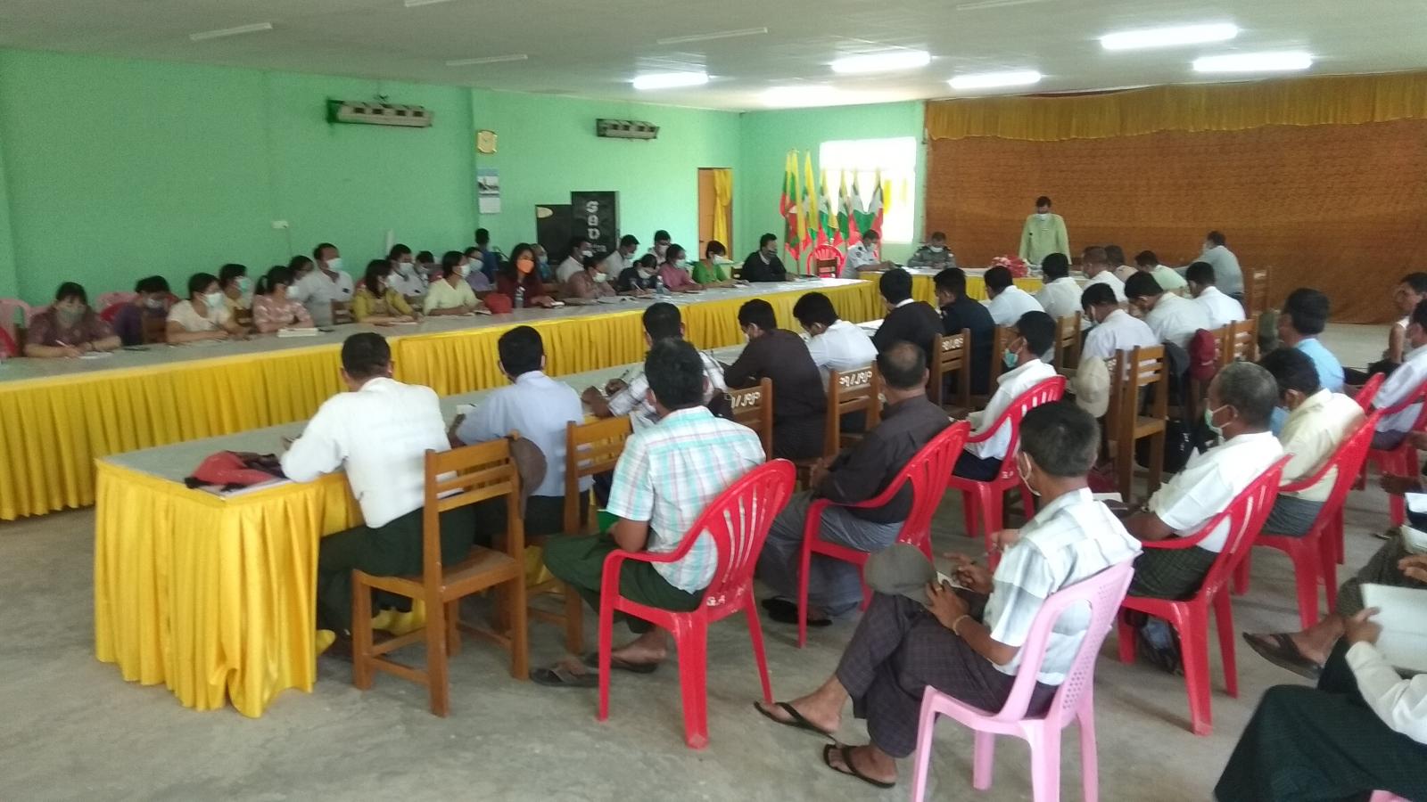 ရှေးဦးစွာ မြို့နယ်စီမံအုပ်ချုပ်ရေးအဖွဲ့ဥက္ကဋ္ဌ ဦးမျိုးသက်အောင်က “ပူပြင်းခြောက်သွေ့သော ရာသီသို့ရောက်ရှိလာသဖြင့် မီးဘေး ကြိုတင်ကာကွယ်ရေးလုပ်ငန်းများ အလေးထား စီမံဆောင်ရွက်ထားရှိကြရန်နှင့် အသိပညာပေးလုပ်ငန်းများကိုလည်း စဉ်ဆက်မပြတ် နှိုးဆော်ဆောင်ရွက်ကြရန်၊ ကိုဗစ်-၁၉ ရောဂါ ကာကွယ်ဆေးထိုးခြင်းကို တစ်မြို့နယ်လုံး အတိုင်းအတာဖြင့် ၈၃ ရာခိုင်နှုန်း ထိုးနှံပြီးစီးကြောင်း၊ လက်ရှိတွင် ဆေးထိုးအဖွဲ့လေးဖွဲ့ဖြင့် ကျေးရွာများသို့ ကွင်းဆင်းထိုးနှံပေးလျက်ရှိပြီး သက်ဆိုင်ရာ တာဝန်ရှိသူများမှ ပူးပေါင်းပါဝင်ကူညီ ဆောင်ရွက်ပေးကြရန်နှင့် လုံခြုံရေးကိစ္စရပ်များကို ဂရုပြုဆောင်ရွက်ရန် “တို့ကို အမှာစကား ပြောကြားပြီး၊ မြို့နယ်စီမံအုပ်ချုပ်ရေးအဖွဲ့ အဖွဲ့ဝင် ဗိုလ်မှူးအာကာဖြိုးနှင့် မြို့နယ်ရဲတပ်ဖွဲ့မှူး ရဲမှူးမြင့်ကျော်တို့က ဒေသတွင်း တည်ငြိမ်အေးချမ်းရေး လုံခြုံရေးနှင့် တရားဥပဒေစိုးမိုးရေးကိစ္စရပ်များကို ဆွေးနွေးပြောကြားခဲ့သည်။
