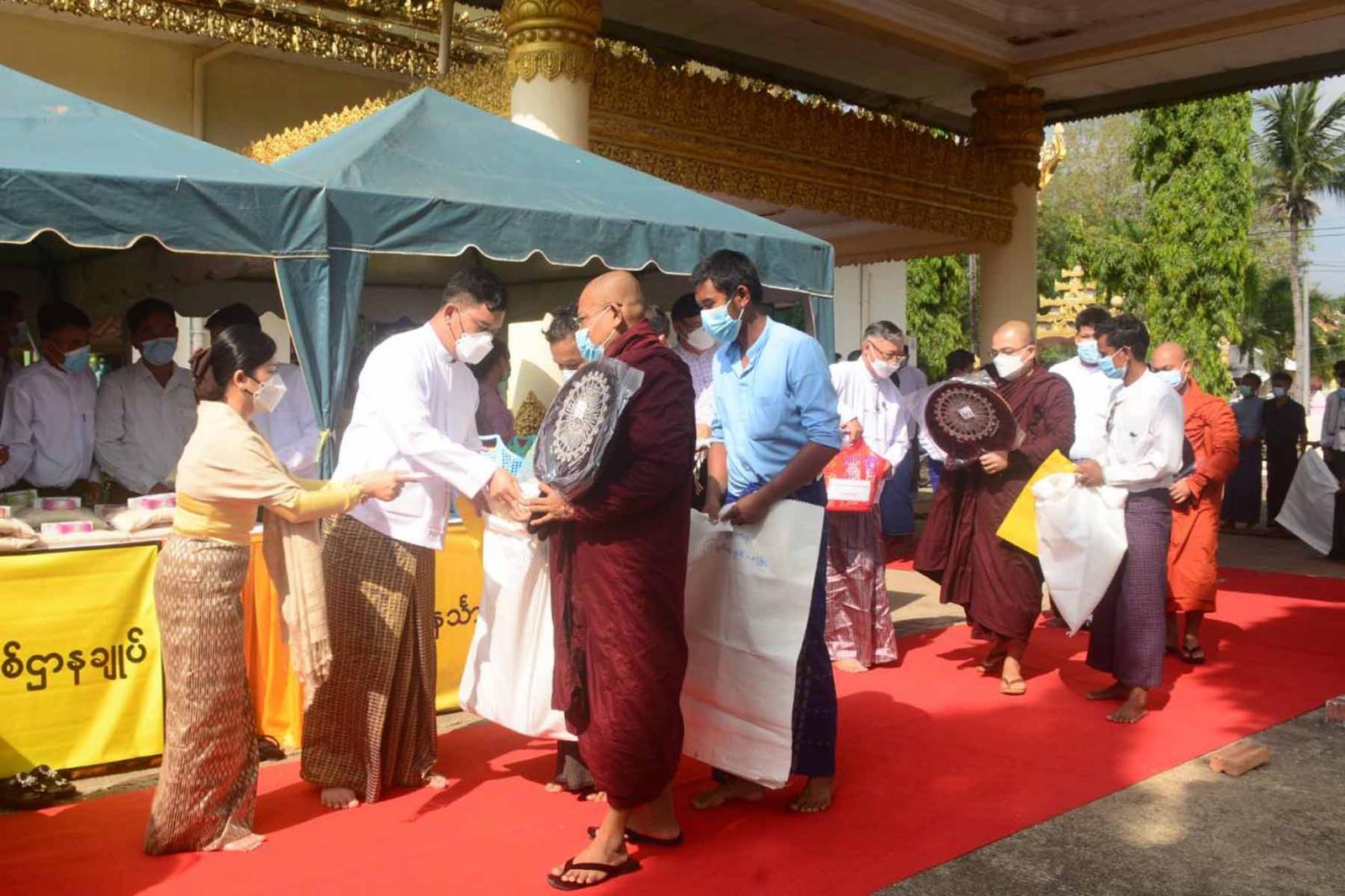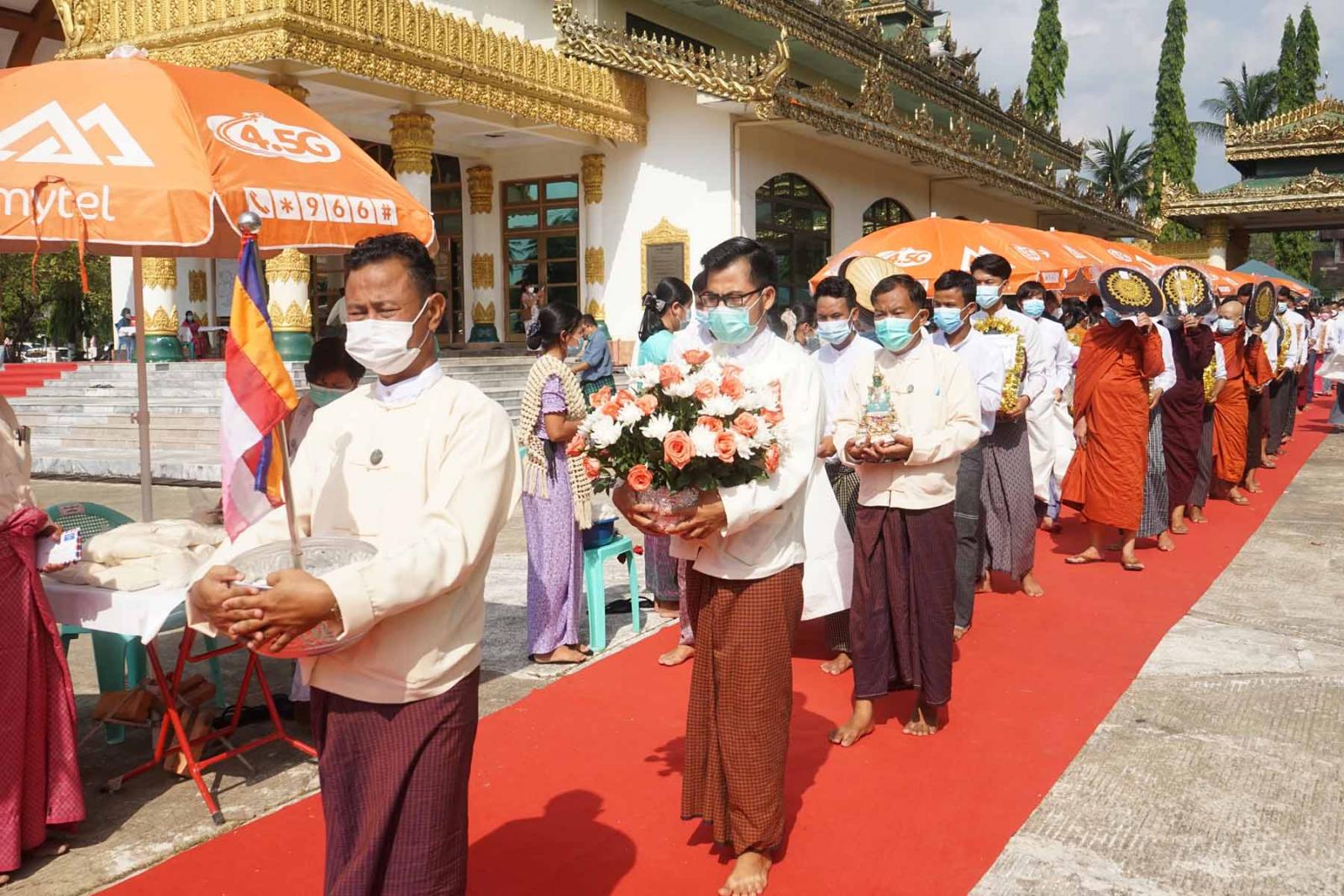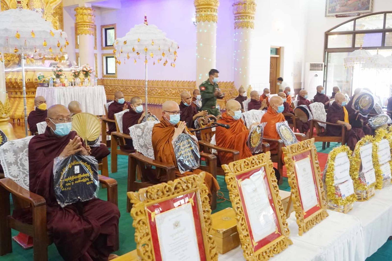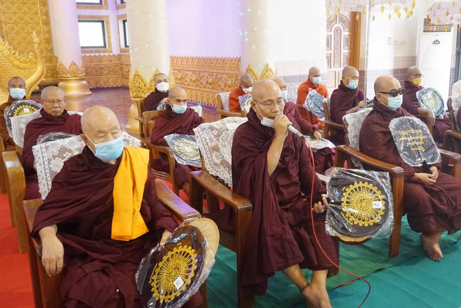 ထို့နောက် သံဃာတော်အရှင်သူမြတ်များ ရွတ်ပွားသရဇ္စျာယ်ချီးမြှင့်တော်မူသော အန္တရာယ်ကင်းပရိတ် တရားတော်များနာယူ ကြည်ညိုခဲ့ကြပြီး တိုင်းဒေသကြီး ဝန်ကြီးချုပ်သီရိပျံချီဦးမြတ်ကိုက သာသနာရေး ဆိုင်ရာများလျှောက်ထားကာ ဘွဲ့တံဆိပ်တော်ရ ဆရာတော်ကြီး(၆)ပါးအား တိုင်းဒေသကြီးဝန်ကြီးချုပ် သီရိပျံ ချီဦးမြတ်ကို၊ ကမ်းရိုးတန်းဒေသတိုင်းစစ်ဌာနချုပ်တိုင်းမှူး ဗိုလ်ချုပ်စောသန်းလှိုင်တို့က ဘွဲ့တံဆိပ်တော်နှင့်လှူဖွယ်ပစ္စည်းများ ဆက်ကပ်လှူဒါန်းပြီး တာဝန် ရှိသူများက သံဃာတော်များအား လှူဖွယ်ပစ္စည်းများဆက်ကပ်လှူဒါန်းသည်။