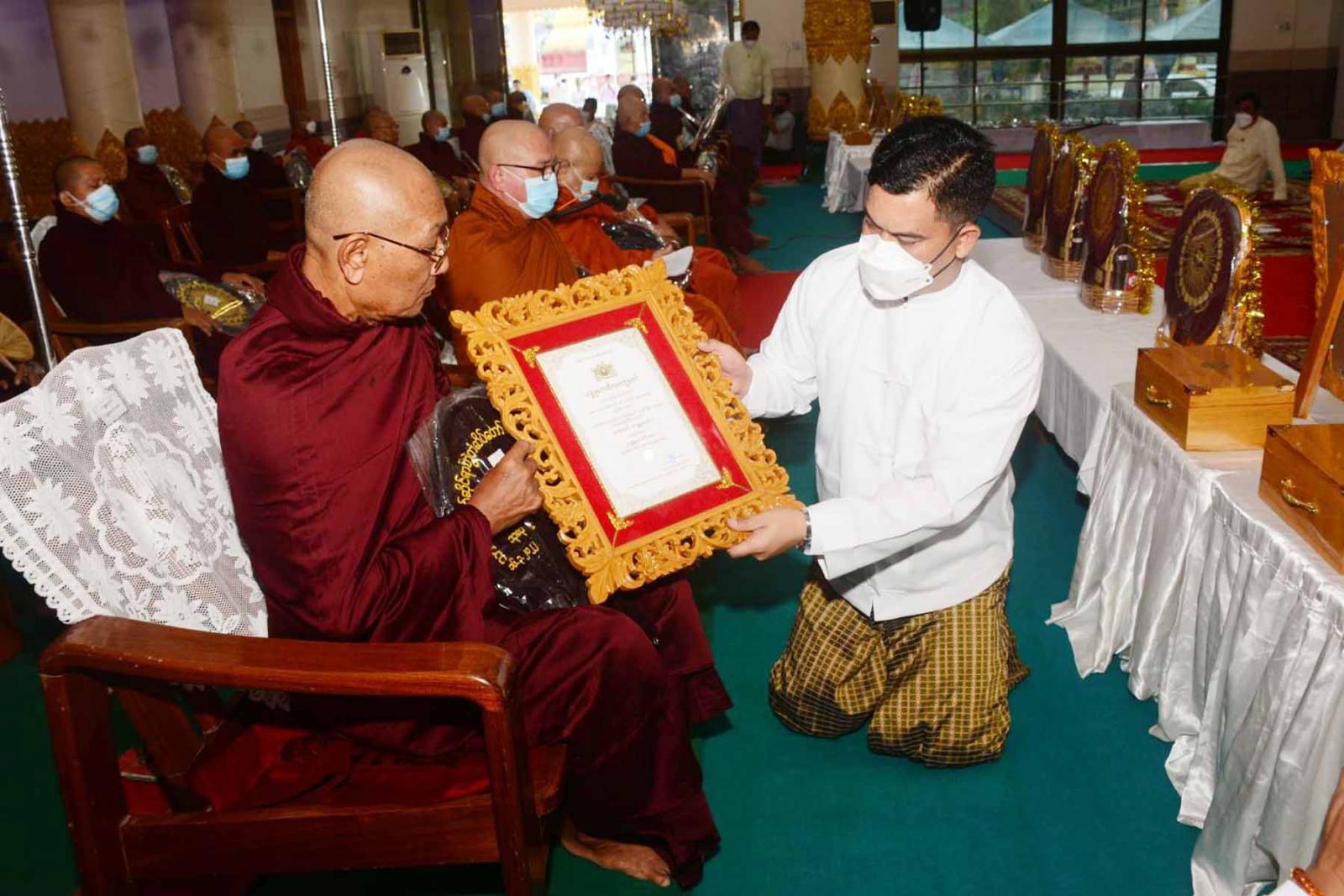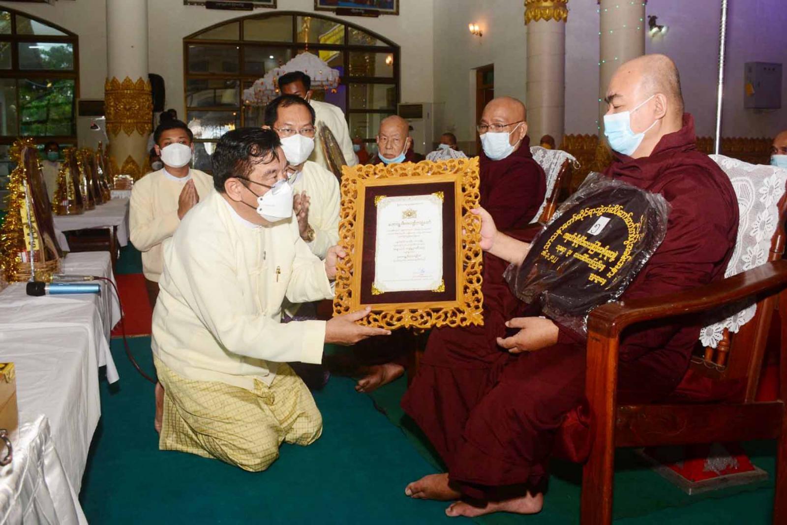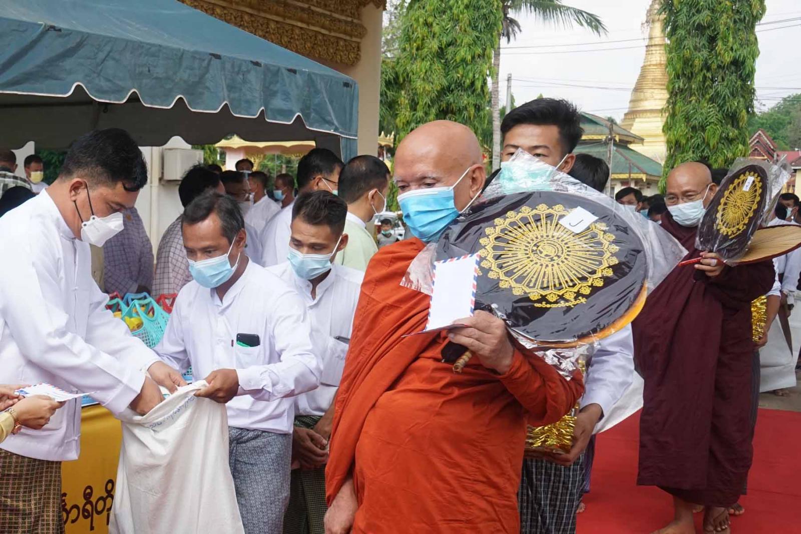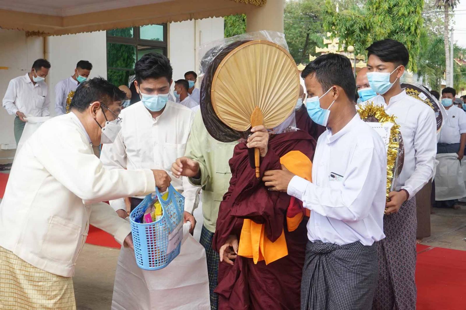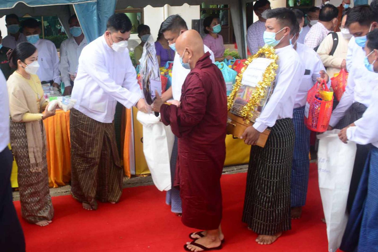 ထို့နောက် သံဃာတော်အရှင်သူမြတ်များ ရွတ်ပွားသရဇ္စျာယ်ချီးမြှင့်တော်မူသော အန္တရာယ်ကင်းပရိတ် တရားတော်များနာယူ ကြည်ညိုခဲ့ကြပြီး တိုင်းဒေသကြီး ဝန်ကြီးချုပ်သီရိပျံချီဦးမြတ်ကိုက သာသနာရေး ဆိုင်ရာများလျှောက်ထားကာ ဘွဲ့တံဆိပ်တော်ရ ဆရာတော်ကြီး(၆)ပါးအား တိုင်းဒေသကြီးဝန်ကြီးချုပ် သီရိပျံ ချီဦးမြတ်ကို၊ ကမ်းရိုးတန်းဒေသတိုင်းစစ်ဌာနချုပ်တိုင်းမှူး ဗိုလ်ချုပ်စောသန်းလှိုင်တို့က ဘွဲ့တံဆိပ်တော်နှင့်လှူဖွယ်ပစ္စည်းများ ဆက်ကပ်လှူဒါန်းပြီး တာဝန် ရှိသူများက သံဃာတော်များအား လှူဖွယ်ပစ္စည်းများဆက်ကပ်လှူဒါန်းသည်။