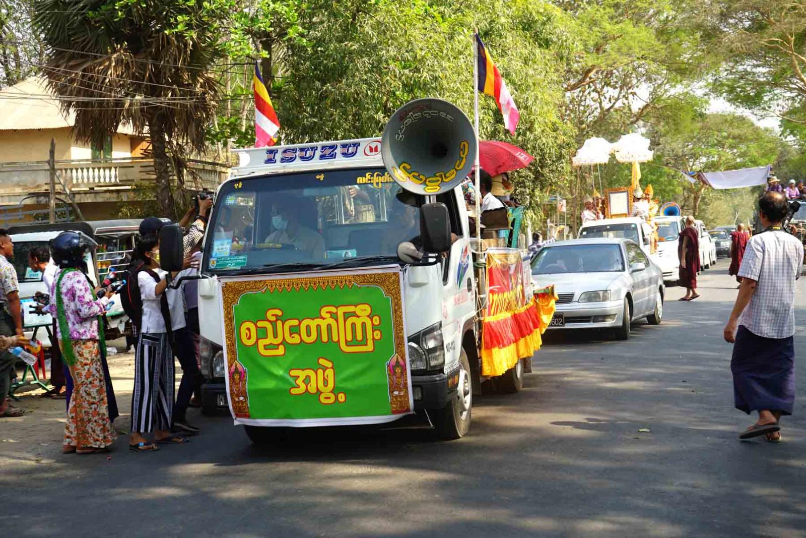 ဆရာတော်ကြိုဆိုမှုတွင် ခရိုင်စီမံအုပ်ချုပ်ရေးအဖွဲ့ ဥက္ကဋ္ဌနှင့် ခရိုင်အဆင့်ဌာနဆိုင်ရာများ၊ မြို့နယ် စီမံအုပ်ချုပ်ရေးအဖွဲ့ ဥက္ကဋ္ဌ နှင့် မြို့နယ်အဆင့်ဌာနဆိုင်ရာများ၊ အကျိုးတော်ဆောင် အဖွဲ့များက ဦးဆောင်၍ ယနေ့ ညနေ ၃ နာရီ အချိန်တွင် မြို့တွင်းသို့ လှည့်လည်အပူဇော်ခံရာ မြို့တွင်း လမ်းတစ်လျှောက် ပြည်သူများက ကြိုဆိုဂုဏ်ပြု၍ အပူဇော်ခံခဲ့သည်။ ထို့နောက် မြို့တွင်းမှ လှည့် လည်အပူဇော်ခံပြီး ဆရာတော်သတင်းသုံးရာ အမှတ်(၁၆) ရပ်ကွက် ဌေးပရိယတ္တိစာသင်တိုက်သို့ ပြန်လည်ကြွချီခဲ့ကြောင်း သိရသည်။