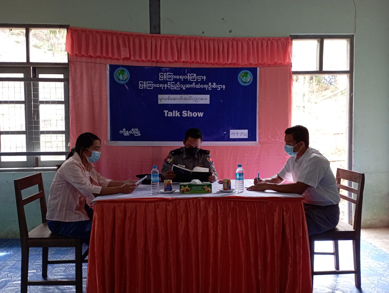 ဆက်လက်၍ ကျိန္တလီနယ်မြေရဲစခန်းမှ ဒုရဲအုပ်ဆက်နွယ်စိုးက ဆွေးနွေးပြောကြားရာတွင် မူးယစ်ဆေးဝါးနှင့် စိတ်ကိုပြောင်းလဲစေသော ဆေးဝါးများဆိုင်ရာ ဥပဒေပုဒ်မ၁၉(က)အရ ပြစ်မှု၊ ပြစ်ဒဏ်၊ မူးယစ်ထုံထိုင်း ဘေးဖြစ်စေတတ်သော ဆေးဝါးများ ဥပဒေပုဒ်မ၆(ခ)နှင့် ပုဒ်မ၁၄(ယ)အရ ပြစ်မှု၊ ပြစ်ဒဏ်၊ မူးယစ်ဆေးဝါးများ ရောင်းချရန်အလို့ငှာ လက်ဝယ်ထားရှိမှုနှင့် ဖြန့်ဖြူး ရောင်းချမှုဆိုင်ရာ ဥပဒေပုဒ်မ ၂၀(က)/၂၁အရ ပြစ်မှု၊ ပြစ်ဒဏ်များစသည့် ပြစ်မှု၊ ပြစ်ဒဏ်များ အကြောင်းကို ပြည်သူများ အသိပညာဗဟု သုတရရှိစေရန်ရည်ရွယ်၍ ဆွေးနွေးခဲ့ကြောင်း သိရသည်။