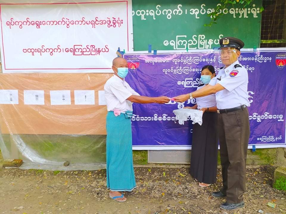 အဆိုပါ နိုင်ငံသားစိစစ်ရေးကတ်ပြားများ ပေးအပ်ရာတွင် မြို့နယ်လူဝင်မှုကြီးကြပ်ရေးနှင့် ပြည်သူ့အင်အား ဆိုင်ရာ မြို့နယ်ဦးစီးမှူး ဦးခင်မောင်ဌေးက နိုင်ငံသားစိစစ်ရေးကတ်ပြား ကိုင်ဆောင်သူ များလိုက်နာရမည့် စည်းကမ်းချက်များ၊ ရရှိခံစားရမည့် အကျိုးကျေးဇူးများ သိကောင်းစရာ များအား ရှင်းလင်းပြောကြားခဲ့ပြီး နိုင်ငံသားစိစစ်ရေးကတ်ပြား (၄၉)ကတ်အား ရပ်ကွက်အုပ်ချုပ်ရေးမှူး ထံသို့ လွှဲပြောင်းပေးအပ်ခဲ့ကြောင်း သိရသည်။